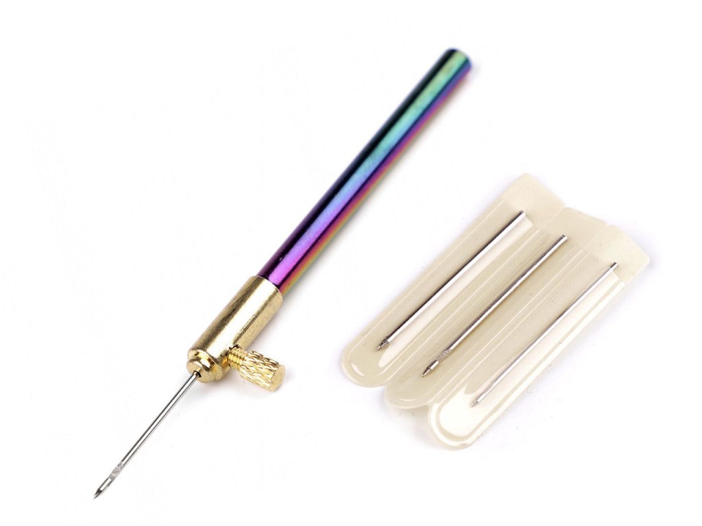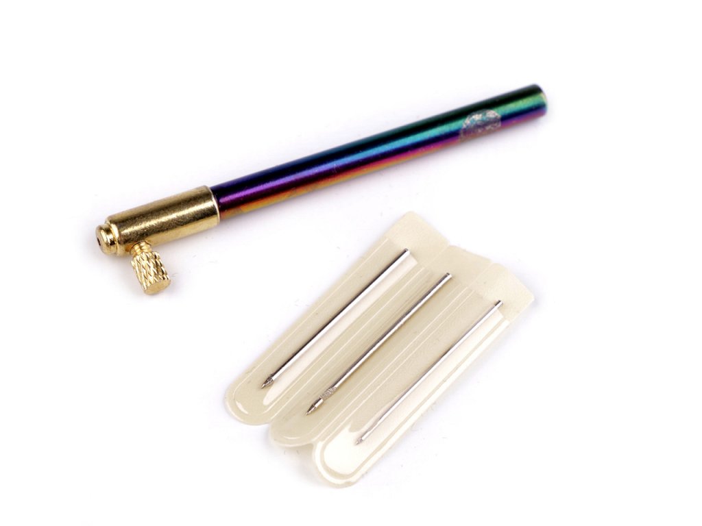 Aari jehla nebo též tamburová jehla, je určená na ruční řetízkovou výšivku a výšivku s korálky či flitry. Hrot jehly je ostrý, aby hezky prošel skrz látku a zpětný háček je lehce zahnutý dovnitř, aby se z něj nevyvlíkla příze. Sada obsahuje kovovou rukojeť a tři jehly o tloušťce háčku 0,8 mm, 0,9 mm a 1,1 mm. Jehly se do rukojeti upevňují pomocí šroubku. Tloušťka rukojeti je 5 mm.- Délka jehly: 3 cm