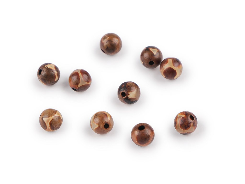 Syntetické korálky Achátu jsou speciálně upravené do tzv. Dzi stylu. Každý korálek je unikátní. Jsou oblíbené především šperkaři pro svou jedinečnou kresbu s oky. Svou velikostí jsou ideální na výrobu jemnějších Buddhových náramků. Jsou oblíbené na techniku drátování, v kombinaci s drahými kovy, ale i s obyčejnými drátky. Skvěle vypadají i na jednoduchých návlekových šňůrách, které zajímavě ozvláštní.- Průměr: 6 mm