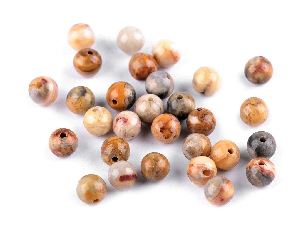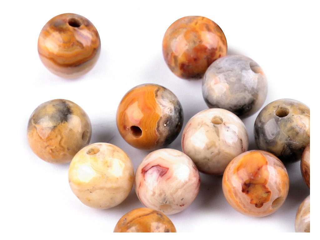 Minerální korálky ze žlutého achátu jsou oblíbené především šperkaři pro svou jedinečnou kresbu a barvy. Svou velikostí jsou ideální na výrobu jemnějších Buddhových náramků. Jsou oblíbené na techniku drátování, v kombinaci s drahými kovy, ale i s obyčejnými drátky. Skvěle vypadají i na jednoduchých návlekových šňůrách, které zajímavě ozvláštní.- Průměr: 6 mm