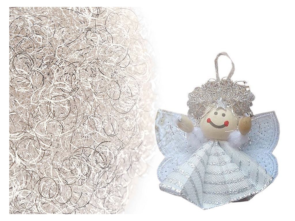 Andělské vlasy jsou vyrobené z jemného kovového vlákna. Jsou zatočeny do kudrlinek a krásně se třpytí. Použití: Andělské vlasy jsou vhodné ke zdobení květinových vazeb, figurek či panenek. O Vánocích zajímavě vyniknou na stromku a adventním věnci.- Hmotnost: 15 g