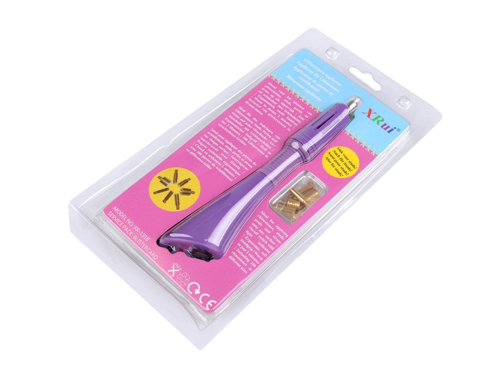 S hotfix aplikátorem docílíte lesk a třpyt na oděvech do pěti vteřin! Hotfix aplikátor je neocenitelná pomůcka při lepení hotfixů, neboli nažehlovacích kamínků či šatonových růží. Hotfix jednoduše vložíme do nástavce, lepidlo na konci flitru se roztaví, přiložíme k látce a lehce přitlačíme. Nahřívání nástavce trvá cca 2 minuty. Můžeme takto jednoduše vytvářet nádherné ozdoby a vzory na látce, riflích nebo taškách. Dodáváme v kompletu se 7 nástavci ( vel. ss6 / 2 mm, ss10 / 3 mm, ss16 / 4 mm, ss20 / 5 mm, ss34 / 7 mm - pro vypouklé hotfixy, vel. 5 a 9 mm pro rovné hotfixy) a stojánkem. Doporučujeme vyzkoušet na malém kousku látky! Nástavec dosahuje vysokých teplot, takže aby nedošlo k poškození látky, pokud by byla z umělého materiálu! Aplikátor se zahřívá na teplotu přibližně 350 °F / 177 °C. Tento typ strojku má vypínač. Na těchto stránkách naleznete detailní návod, jak pracovat s hotfix aplikátorem. Náš tip: Před prvním použitím naberte 2 kamínky opačně, tzn. plochou stranou do aplikátoru, nechejte lepidlo rozpustit a odstraňte pryč (lepidlo se nalepí na nástavec a kamínky pak lépe drží). Poté už kamínky bez problému nabírejte sklem do aplikátoru a plochá strana je volná. Aplikátor má 200/300V. Upozorňujeme, že aplikátor je určený pouze na lepení skleněných korálků a hotfixů, plastové korálky se roztaví!- Průměr kamínku: 2; 3; 4; 5; 7; 9 mm