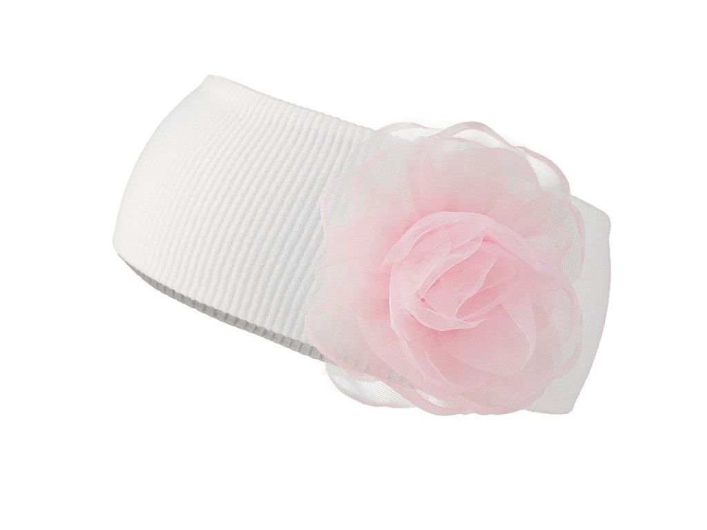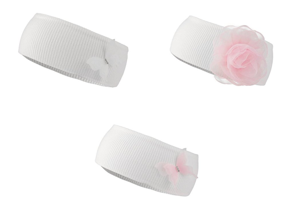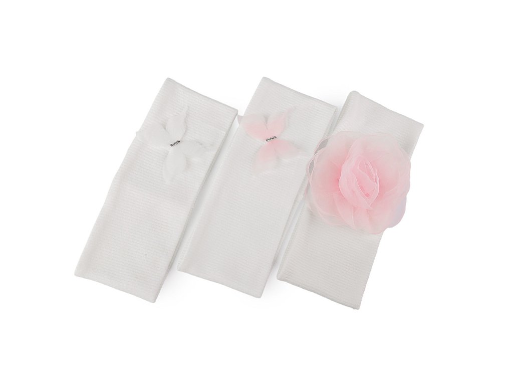 Bavlněná čelenka pro miminko s ozdobou je půvabným doplňkem, který je jemný a šetrný k citlivé dětské pokožce. Je ušitá z materiálu, který příjemně pruží. Můžete ji využít jako každodenní ozdobu, která oživí jakýkoli outfit vašeho miminka, oceníte ji i na rodinné focení a různé slavnostní příležitosti. Volně položený obvod čelenky je 34 cm, natažený až 44 cm. Je široká 7 cm. Čelenka č.1 a 3 je ozdobená motýlem s broušenými kamínky, které se jemně třpytí. Čelenka č.2 je ozdobená textilním květem o průměru 9 cm.- Obvod: 34 - 44 cm