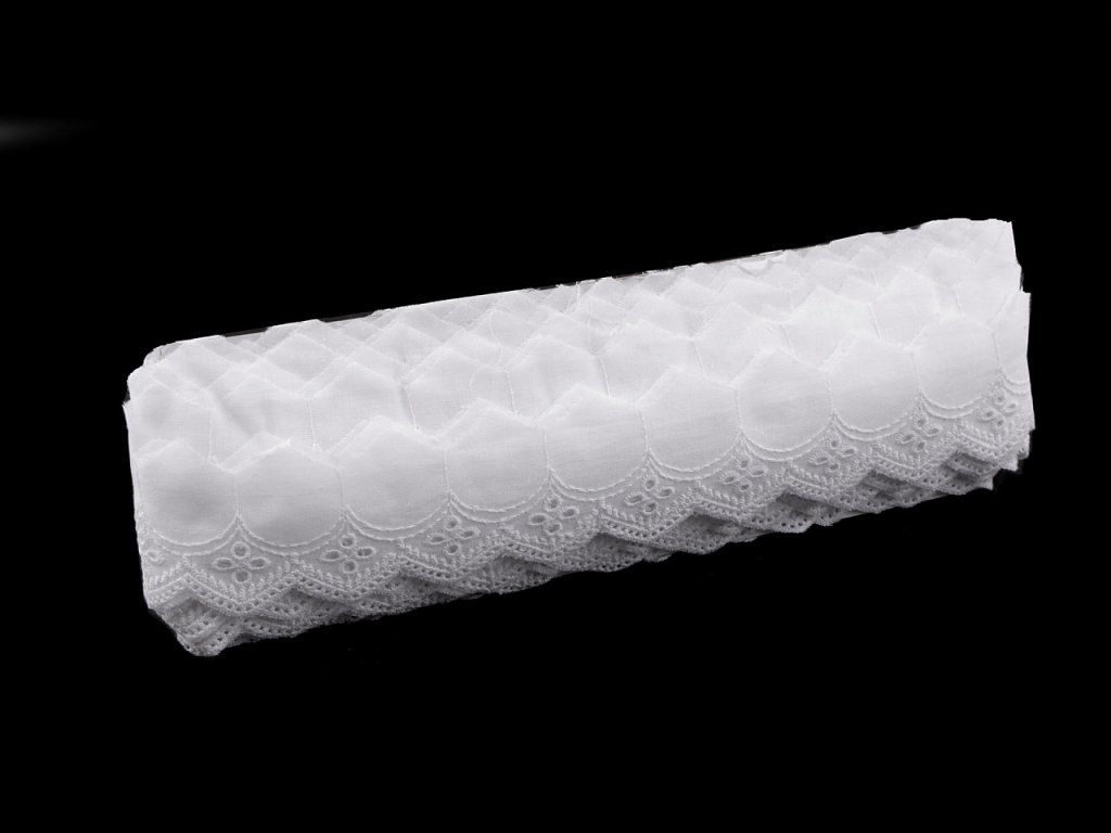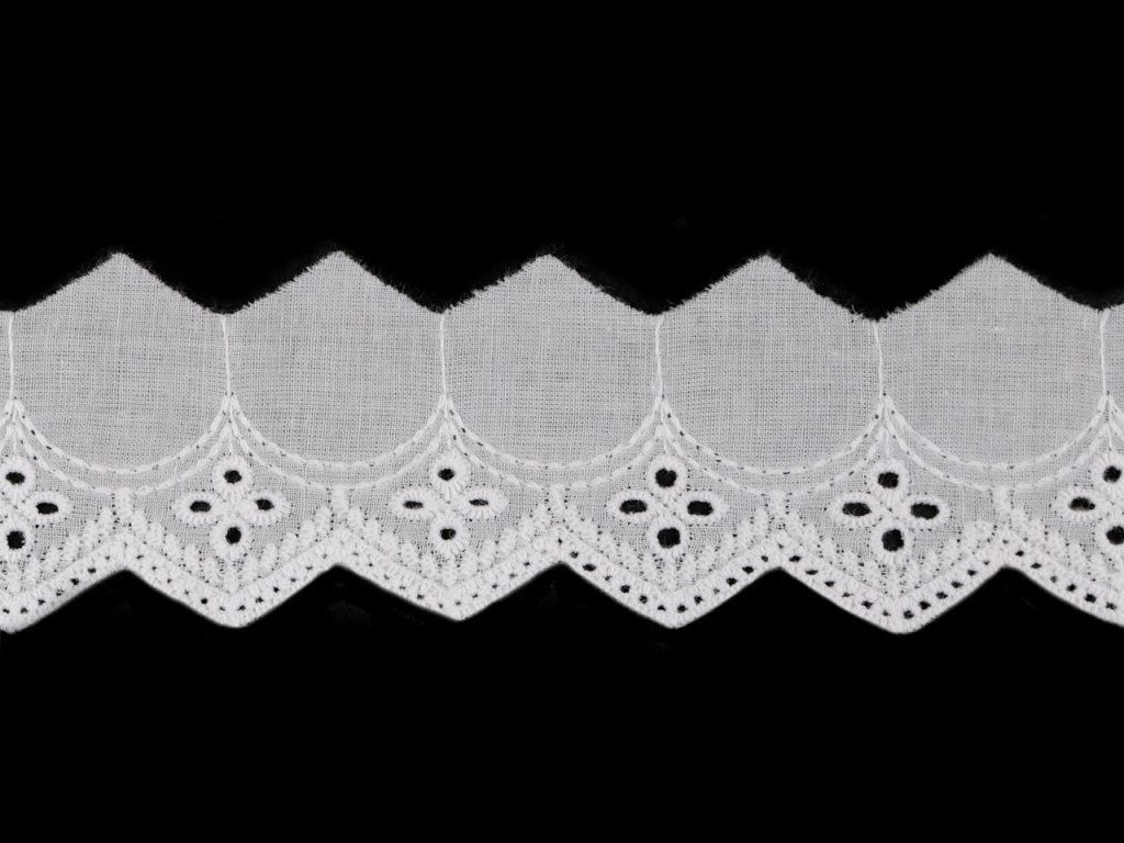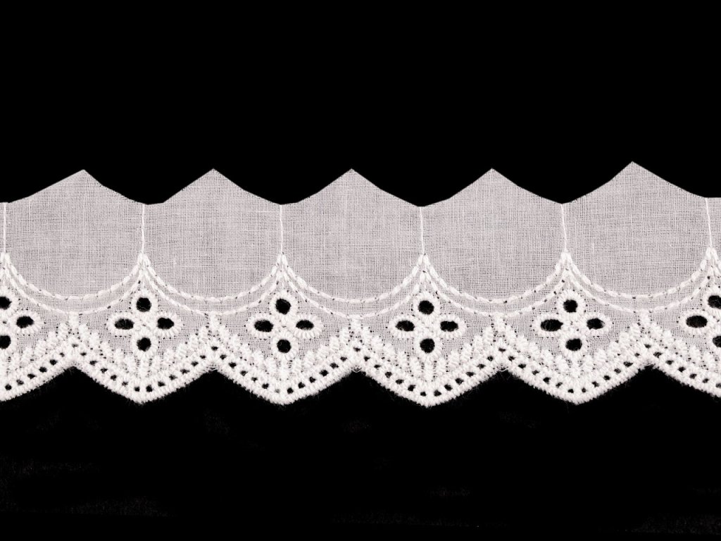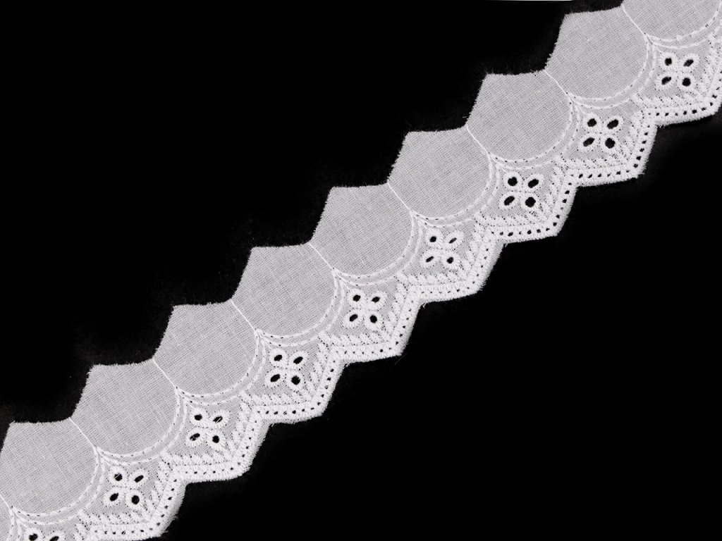 Bavlněná madeira je zdobená dírkovanou výšivkou a lemovanými okraji. Využijete ji na zdobení polštářů a ubrusů. Je vhodná také k našití na halenky, sukně a lidové kroje. Šíře nevyšité části se může mírně lišit (±10%).- Šíře: 45 mm