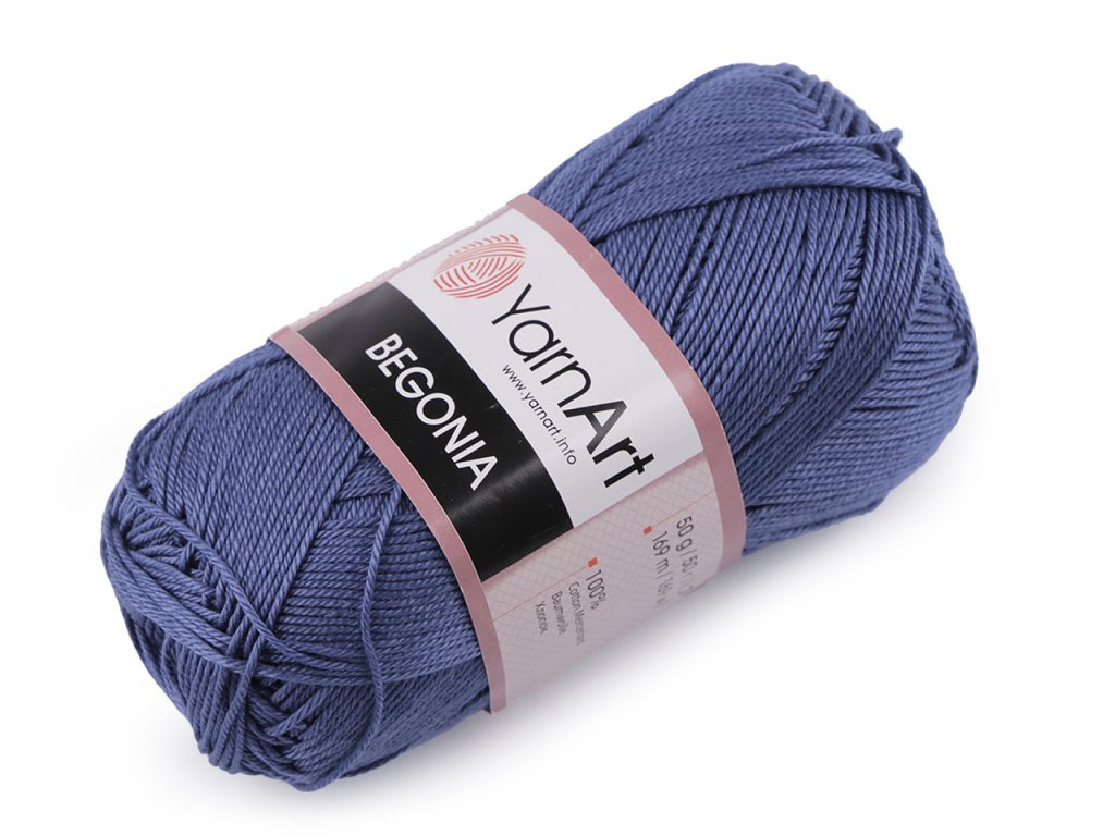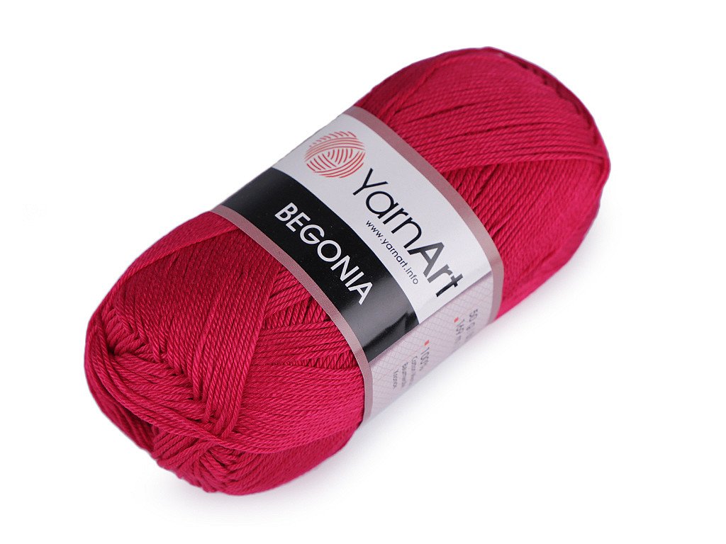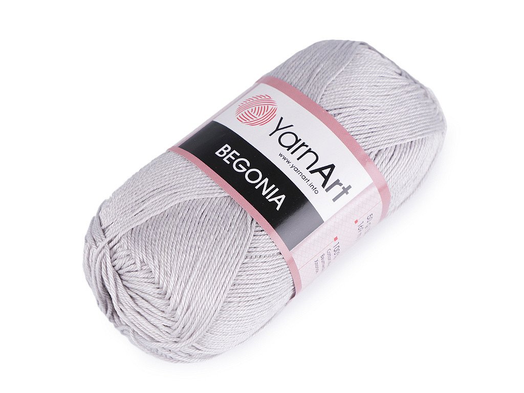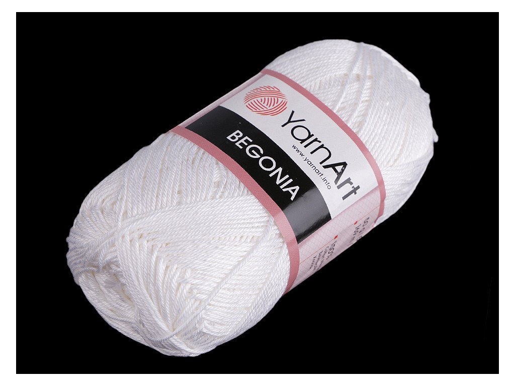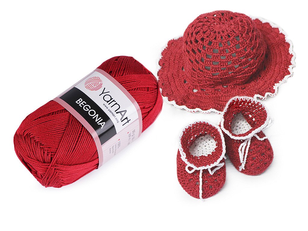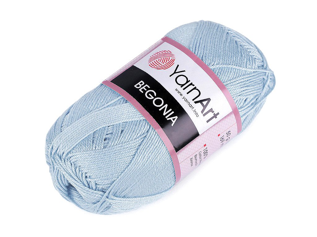 Pletací příze Begonia je vyrobená z mercerované bavlny. Mezi její výhody patří, že je na dotek jemnější, lesklejší a stálobarevná. Využijete ji na pletení či háčkování dekorací, hraček, zvířátek, ponožek, svetříků, dětských doplňků i oděvů apod. Velikost jehlic: 3 Velikost háčku: 3,5 Tloušťka příze je 1 mm.- Hmotnost: 50 g