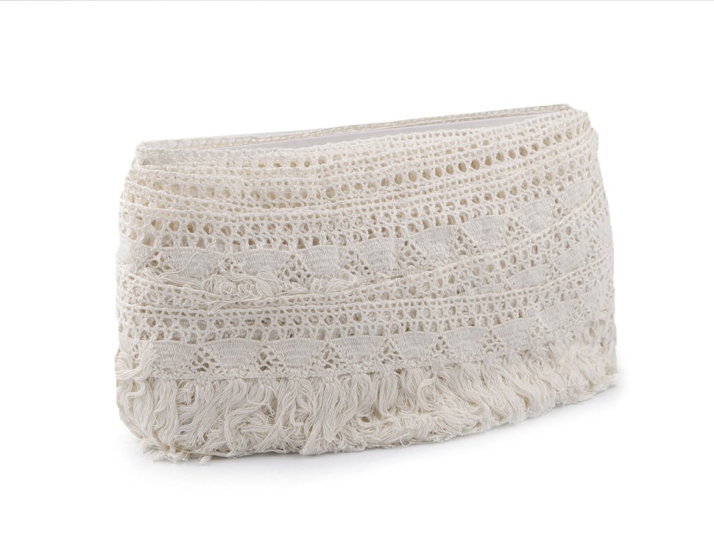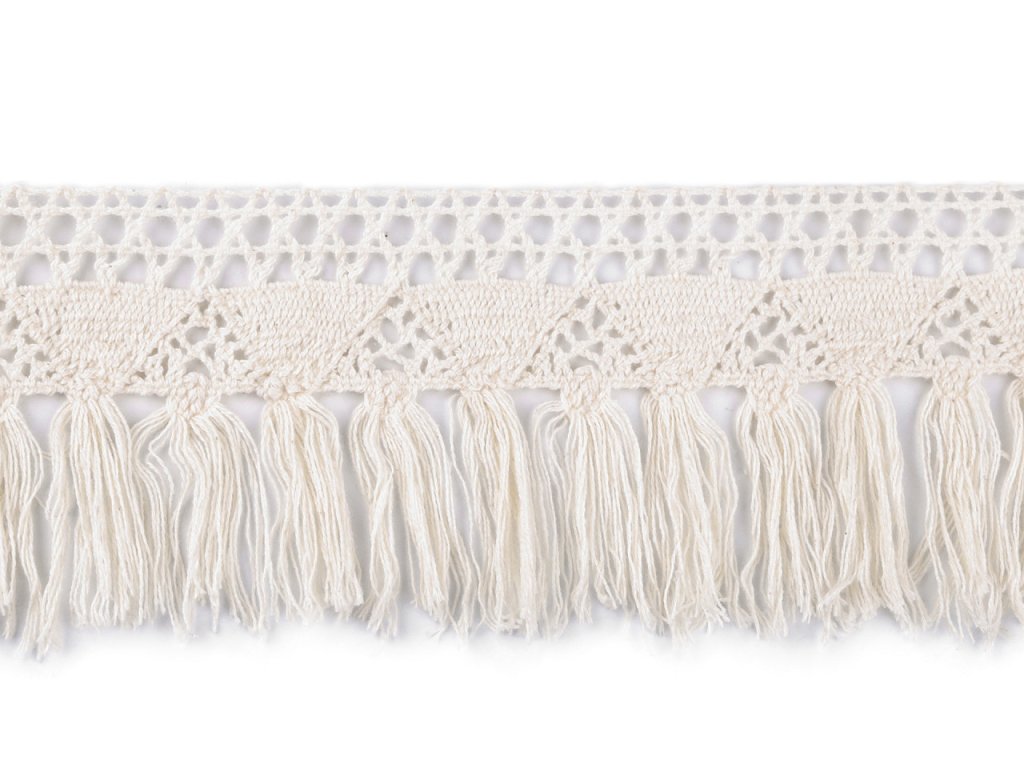 Bavlněné třásně s paličkovanou krajkou zaujmou na první pohled. Využijete je na ozdobení různých deček a ubrusů, závěsů, polštářů, kabelek a tašek v boho stylu apod. Skvěle poslouží i na ozdobení karnevalových kostýmů.- Šíře: 70 mm