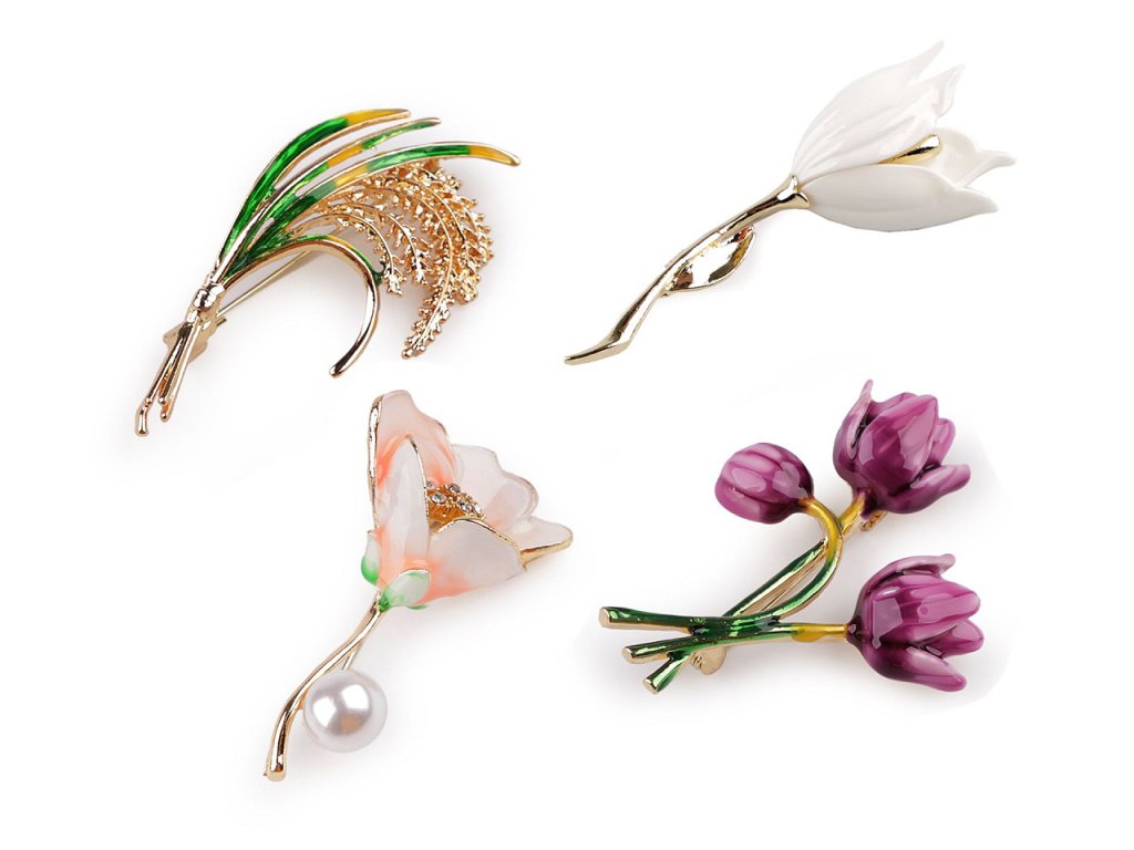 Kovová brož květu s barevným smaltem vás uchvátí svými romantickými tvary. Je velice elegantní, můžete ji využít na běžné nošení i na společenské události - návštěvy divadel, oslavy apod. Z rubu má brož zavírací špendlík. Můžete ji nosit nejen na oděvech, hodí se i k ozdobení klobouků, tašky či sepnutí šátku. Brož je na plastové kartě, kterou lze zavěsit na prodejní stojany. Brož č.1 má plastový květ. Brož č.3 je ozdobená perlou a broušenými kamínky.- Rozměry: č. 1: 2,7 x 7,5 cm