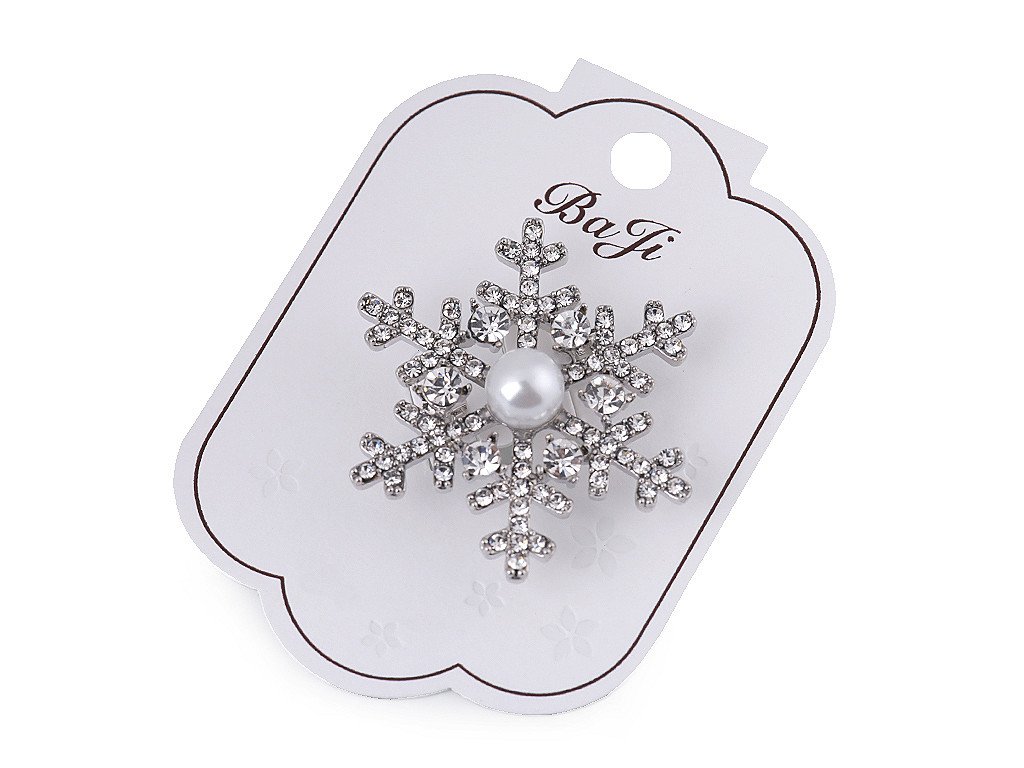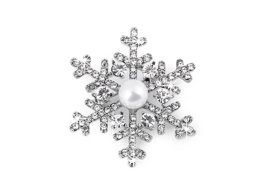 Brož sněhová vločka je osázená broušenými kamínky, které se efektně třpytí. Jemnost a eleganci vločce propůjčuje perla umístěná ve středu brože. Vločka skvěle ozdobí zimní čepice, svetry apod. Můžete ji nosit na oděvech, kloboucích, taškách či s ní můžete sepnout šálu. Na zadní straně je brožový špendlík. Brož je na kartě, kterou lze zavěsit na prodejní stojany.- Průměr: 3,8 cm