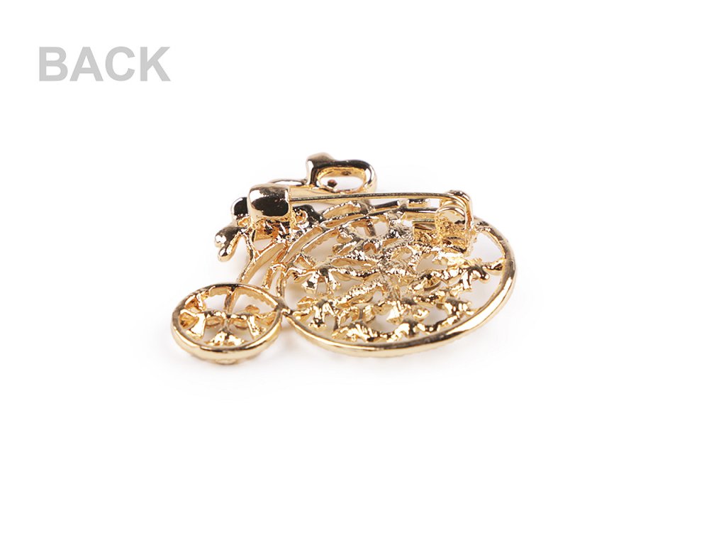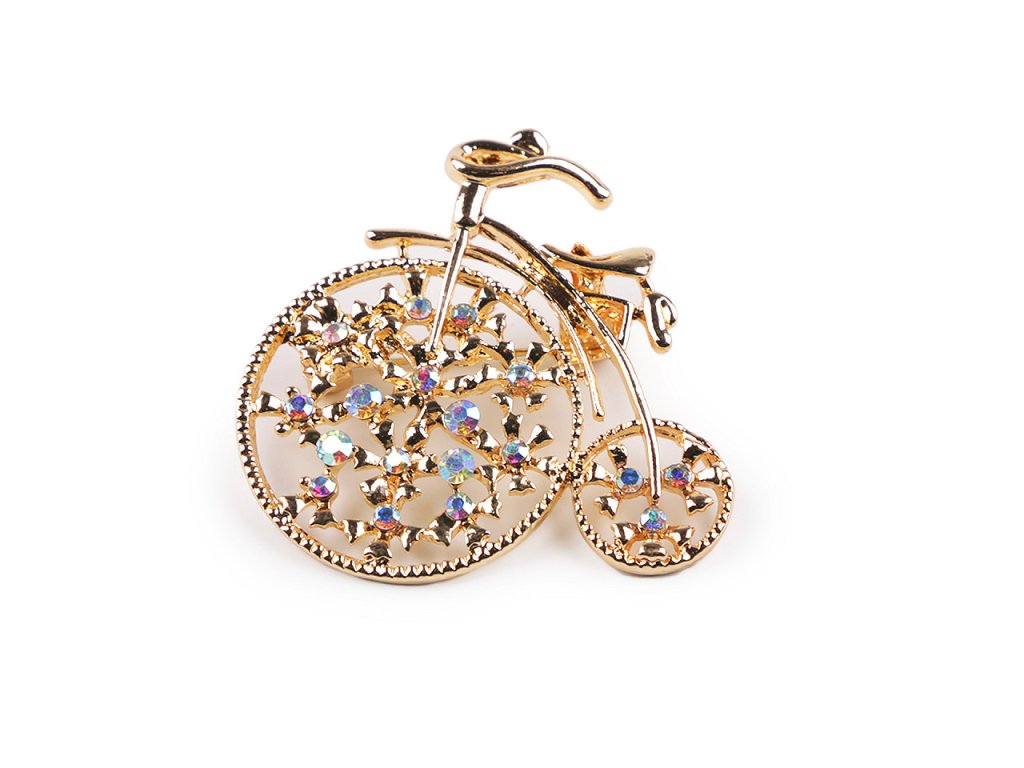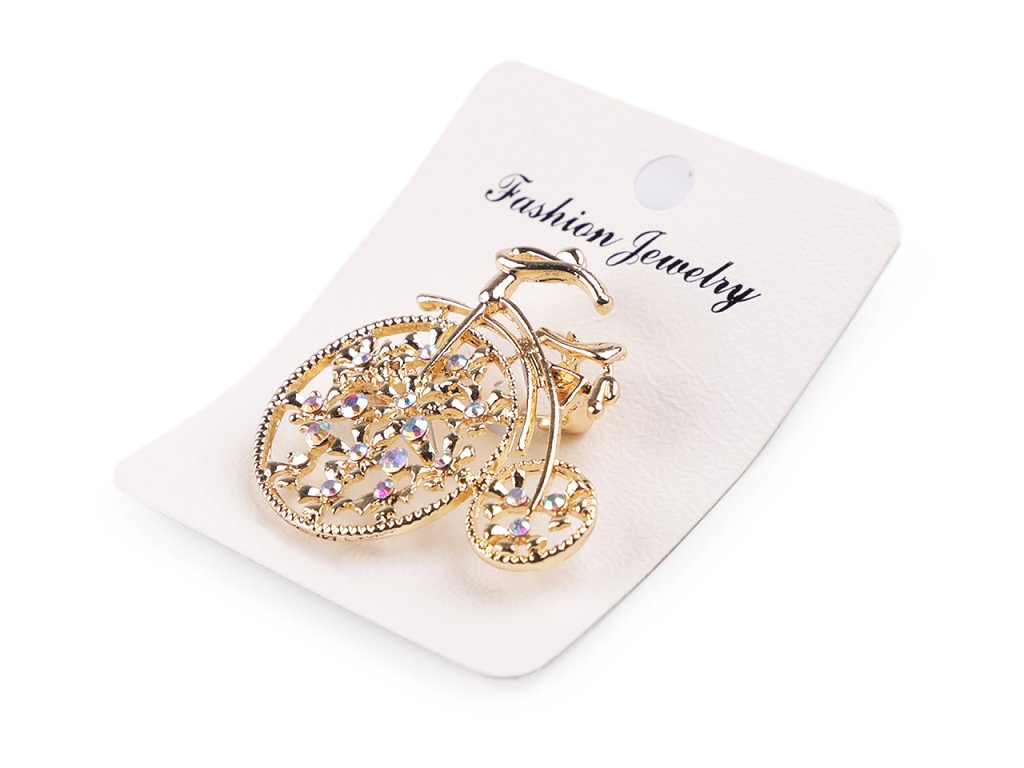 Originální brož bicyklu zaujme všechny romantické duše. Tato nostalgická brož je osázená broušenými kamínky s AB efektem, které se poutavě třpytí. Oceníte ji na nošení ve všedních dnech i na společenské události - návštěvy divadel, oslavy apod. Na zadní straně má brožový špendlík. Brož můžete nosit nejen na oděvech, ale hodí se i k ozdobení klobouků, tašky či sepnutí šátku. Je na plastové kartě, kterou lze zavěsit na prodejní stojany.- Rozměry: 4,2 x 4,2 cm