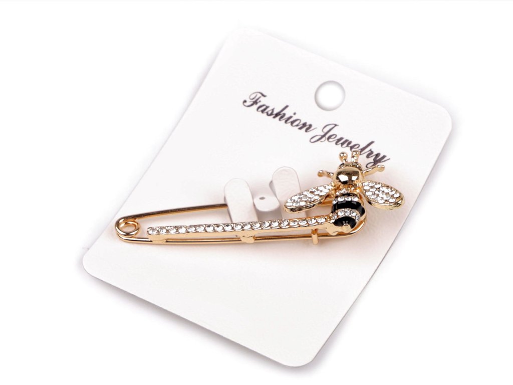 Brož na spínacím špendlíku zdobí včelka osázená broušenými kamínky. Vzhledem ke své tloušťce je vhodnější na pleteniny a podobné tkaniny, ne na jemné materiály. Brož je na kartě, která se dá zavěsit na prodejní stojany.- Šířka: 2 cm