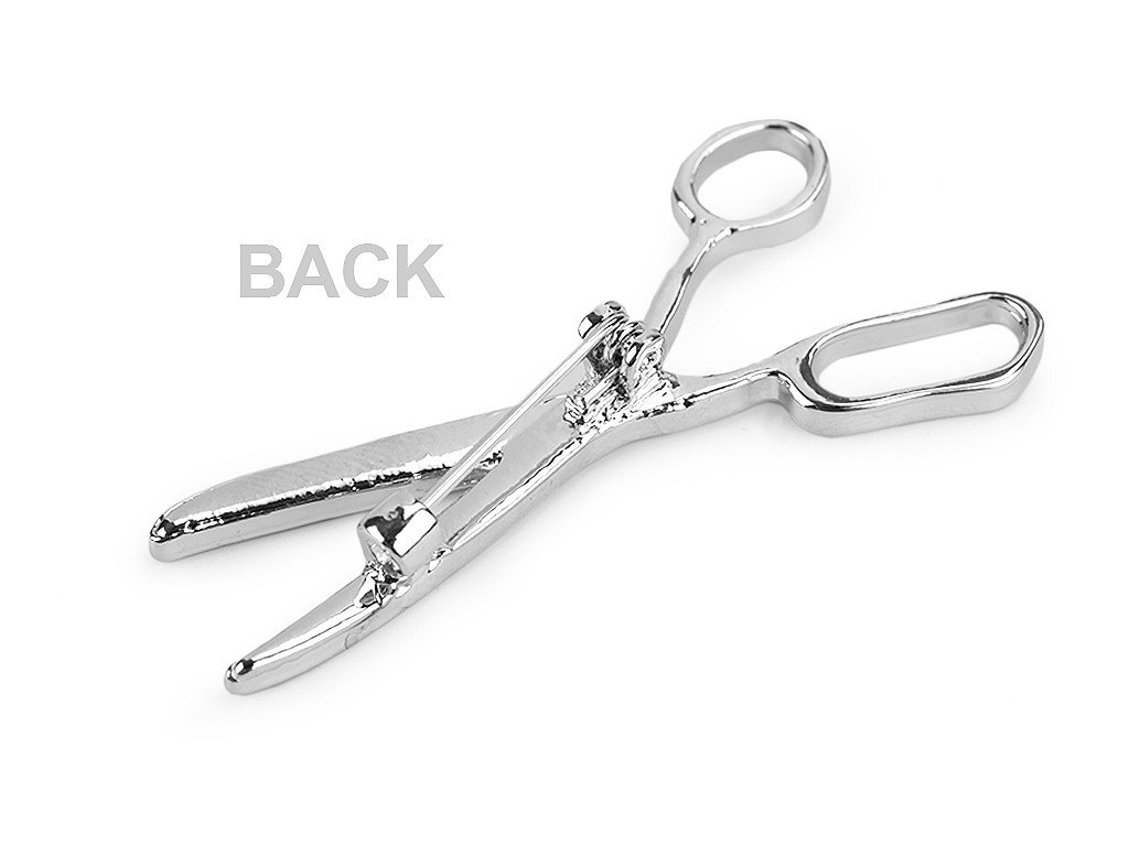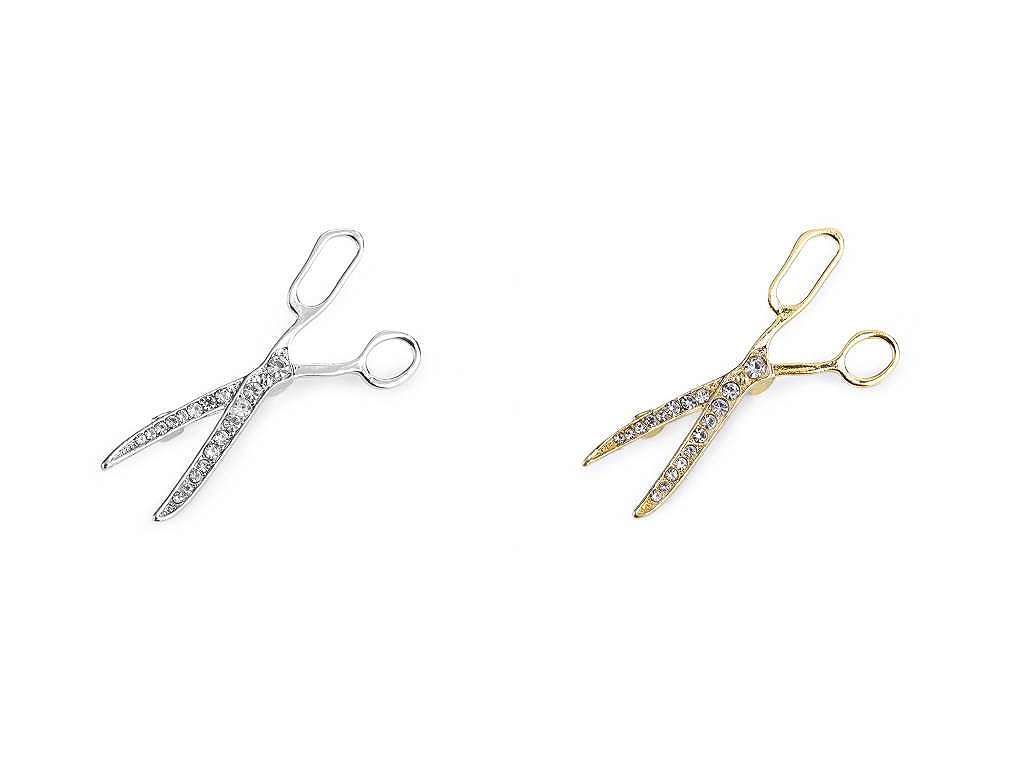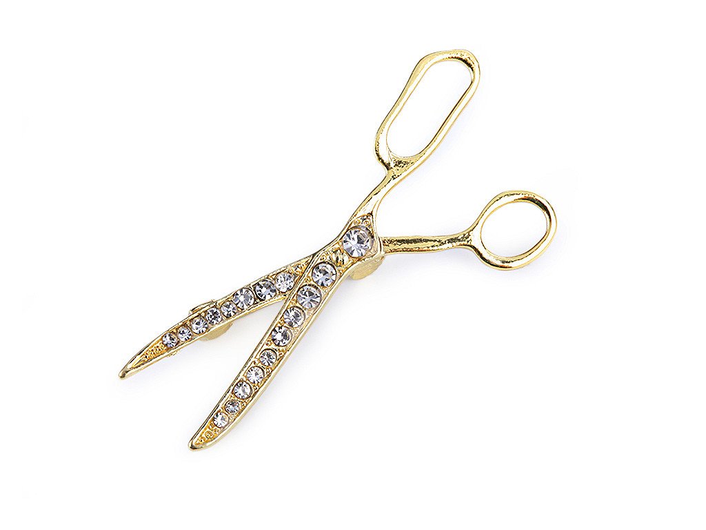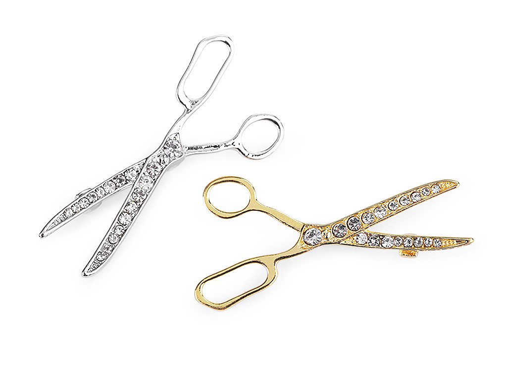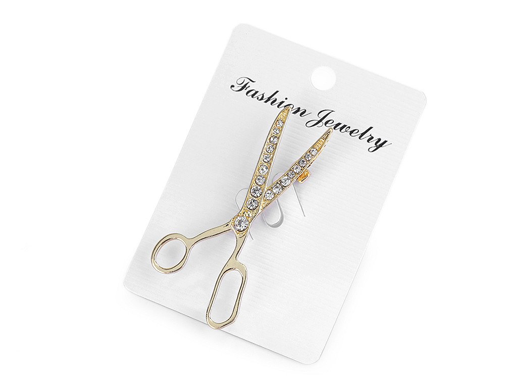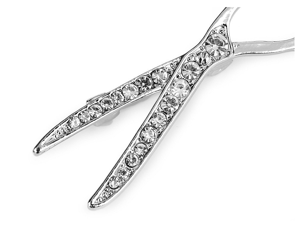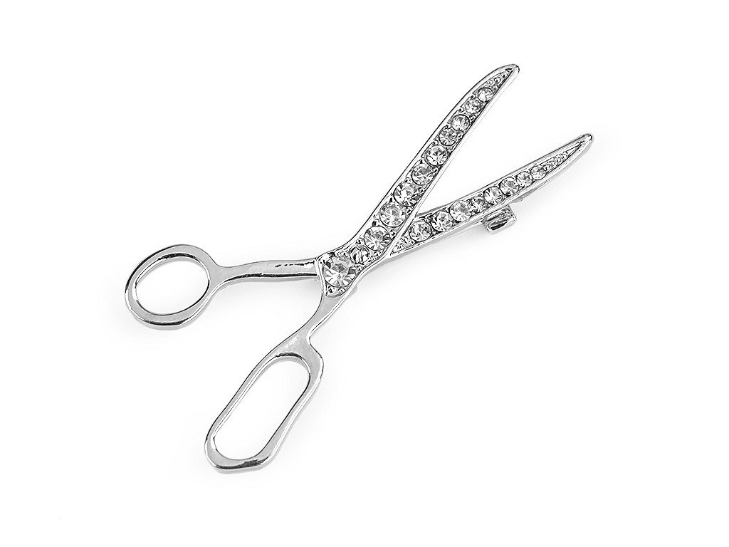 Elegantní brož nůžky bude skvělým dárkem nejen pro švadlenku nebo kadeřnici. Je osázená třpytivými, broušenými kamínky. Ze zadní strany má zavírací špendlík. Efektně působí nejen na oděvech, ale je vhodná i k ozdobení klobouků, tašky či sepnutí šátku. Brož je na plastové kartě, kterou lze zavěsit na prodejní stojany.- Rozměry: 2,7 x 5,6 cm