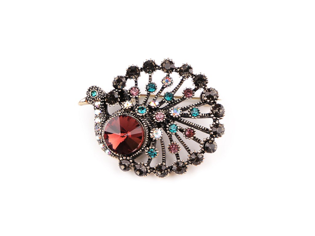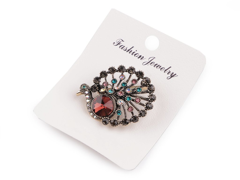 Elegantní paví brož se díky broušeným kamínkům efektně třpytí. Hraje všemi barvami, ale v decentním, tlumeném tónu. Ze zadní strany má zavírací špendlík. Efektně působí nejen na oděvech, ale je vhodná i k ozdobení klobouků, tašky či sepnutí šátku. Brož je na plastové kartě, kterou lze zavěsit na prodejní stojany.- Rozměry: 3 x 3,8 cm