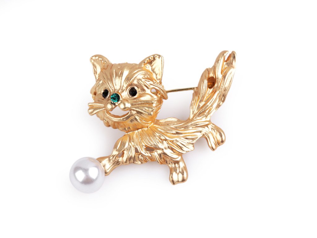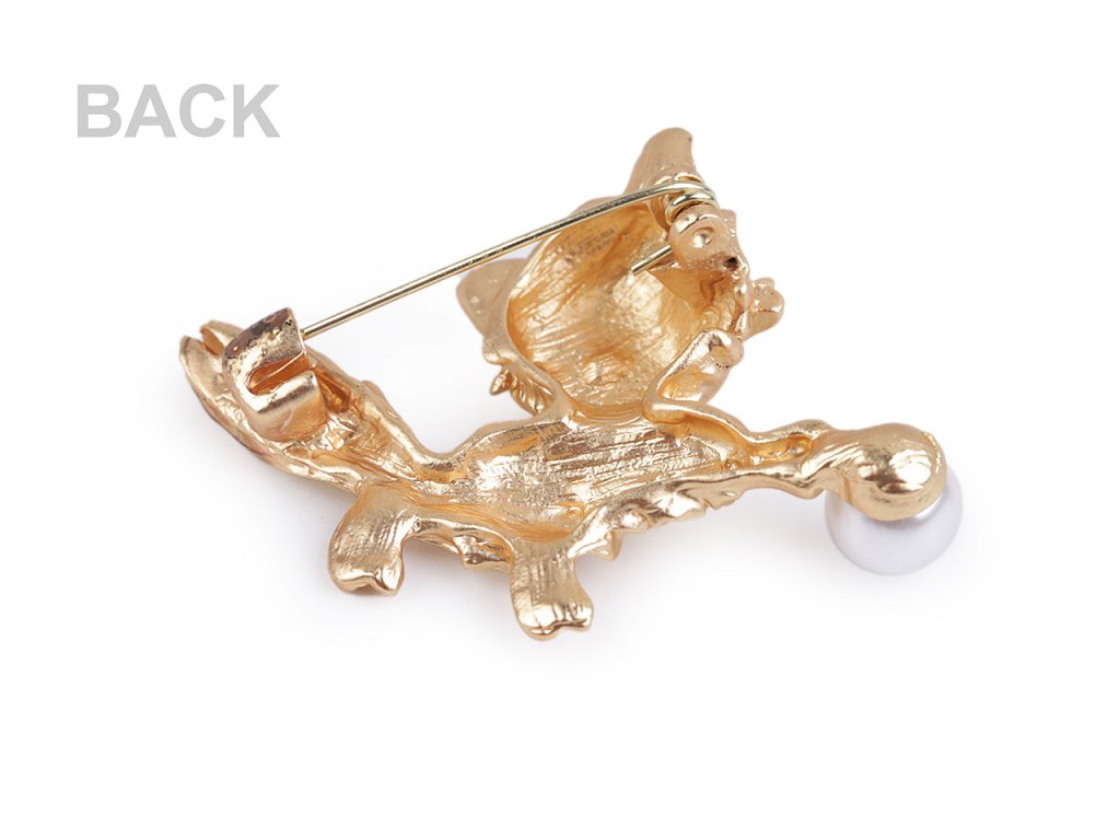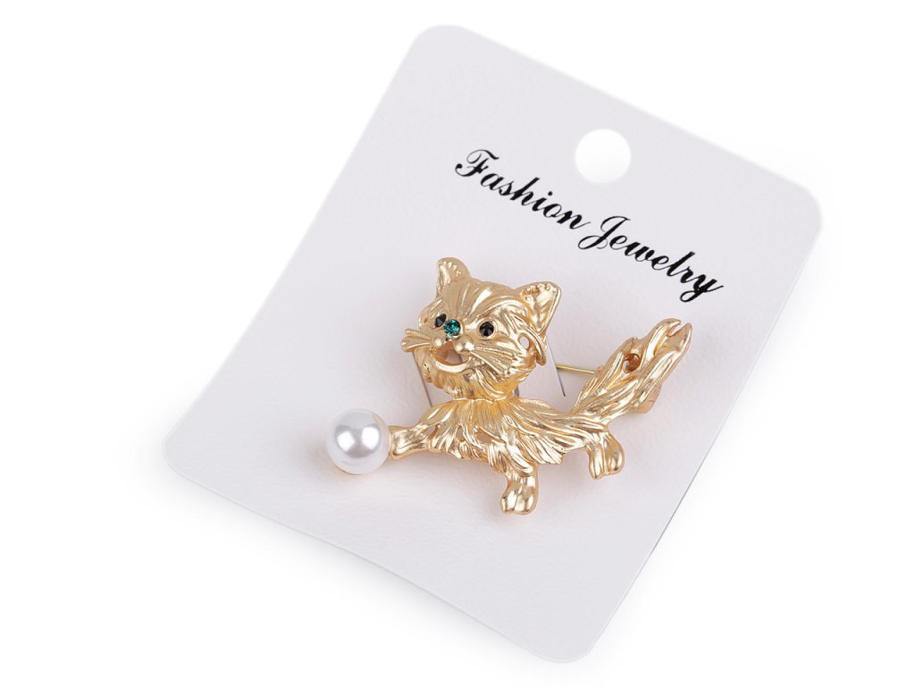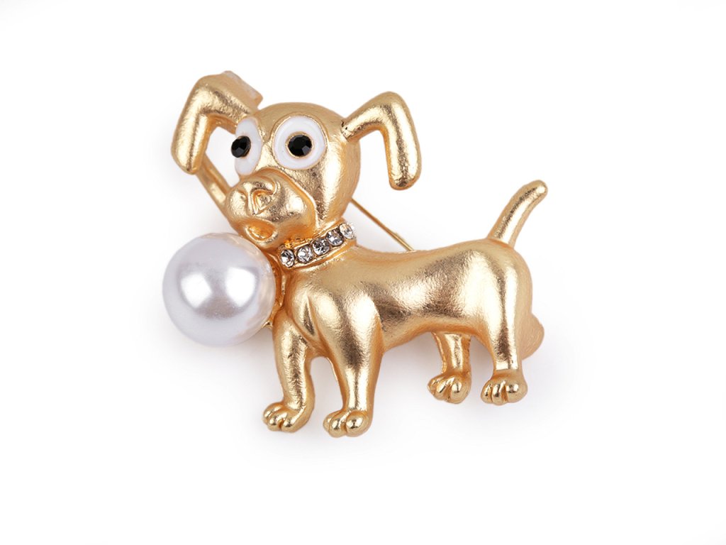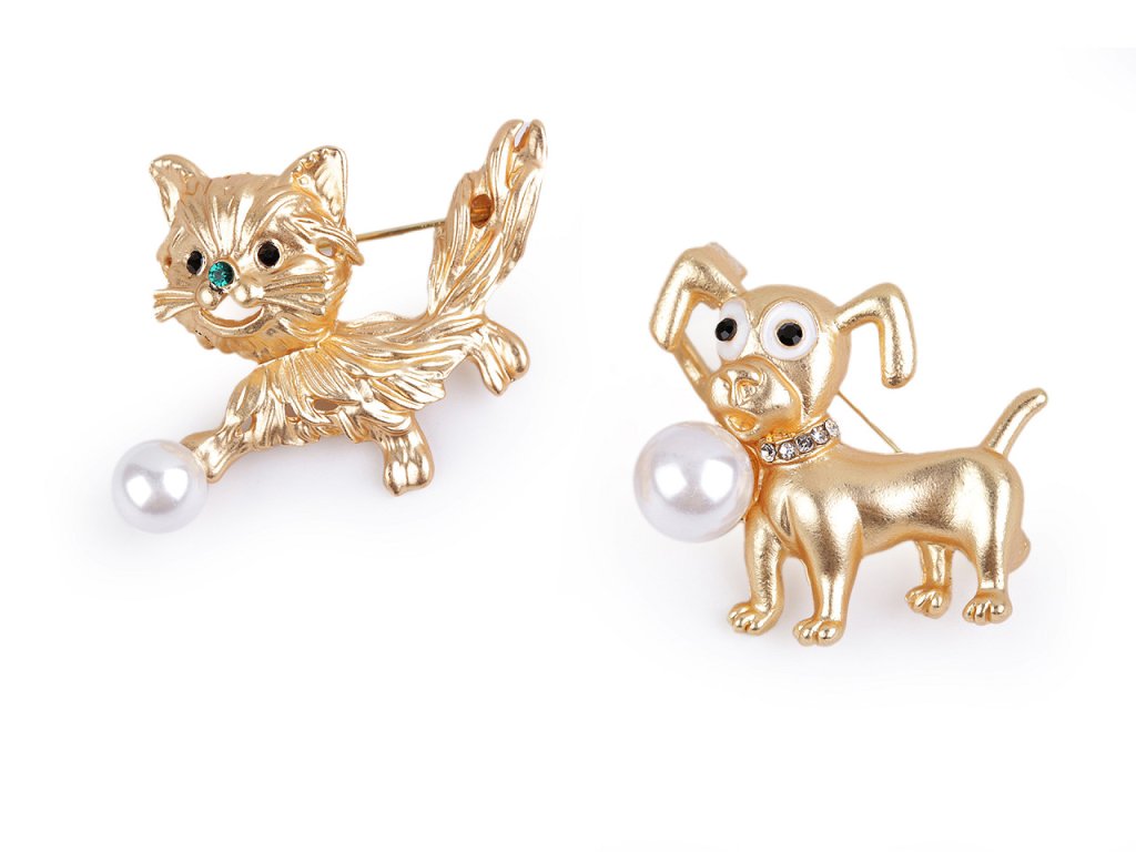 Metalická kovová brož roztomilých pejsků je decentně doplněná broušenými kamínky a perlou. Působivě vám dozdobí oděvy i doplňky (tašky, klobouky, šátky.). Zapíná se pomocí spínacího špendlíku. Brož je na plastové kartě, která se dá zavěsit na prodejní stojany.- Rozměry: č. 1: 3,3 x 3,8 cm