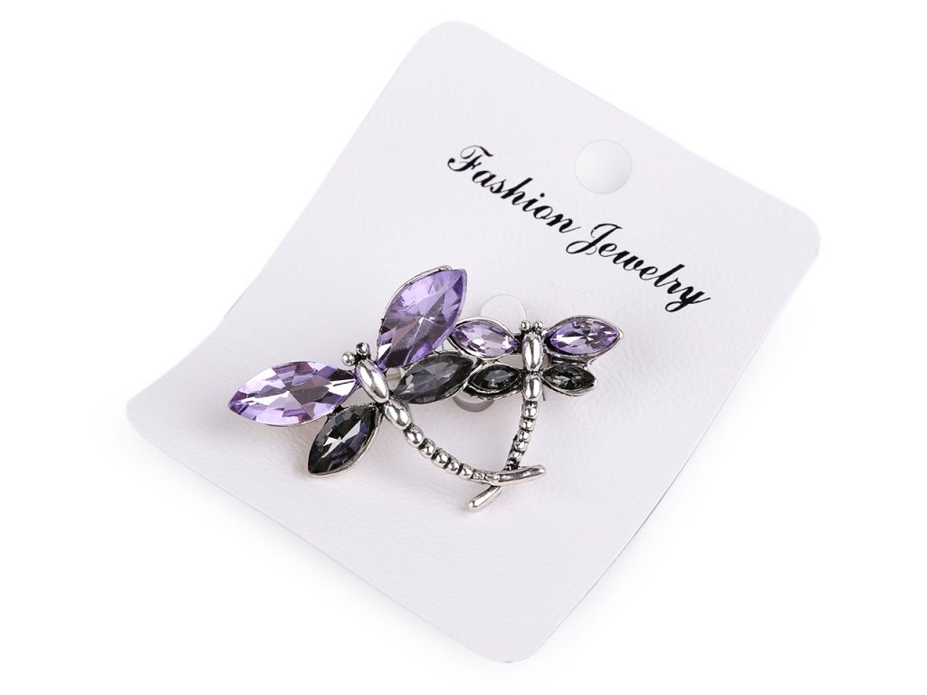 Brož ve tvaru vážky je velice elegantní, je ideálním dárkem pro ženy všech věkových kategorií. Je osázená drobnými broušenými kamínky, které se krásně třpytí. Zapíná se pomocí spínacího špendlíku. Brož můžete nosit nejen na oděvech, ale hodí se i k ozdobení klobouků, tašky či sepnutí šátku. Brož je na plastové kartě, kterou lze zavěsit na prodejní stojany.- Rozměry: č. 1: 2,7 x 4,6 cm