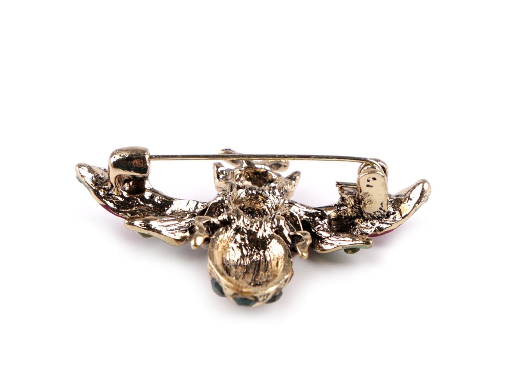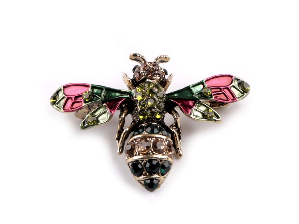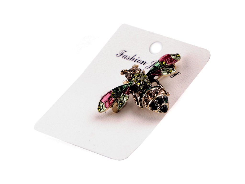 Kovová brož včela vyniká svým zpracováním - podbarvený povrch je místy doplněný barevnými broušenými kamínky. Působivě vám zkrášlí oděvy i doplňky (tašky, klobouky, šátky.). Zapíná se pomocí spínacího špendlíku. Brož je na plastové kartě, která se dá zavěsit na prodejní stojany.- Rozměry: 3,3 x 4,5 cm