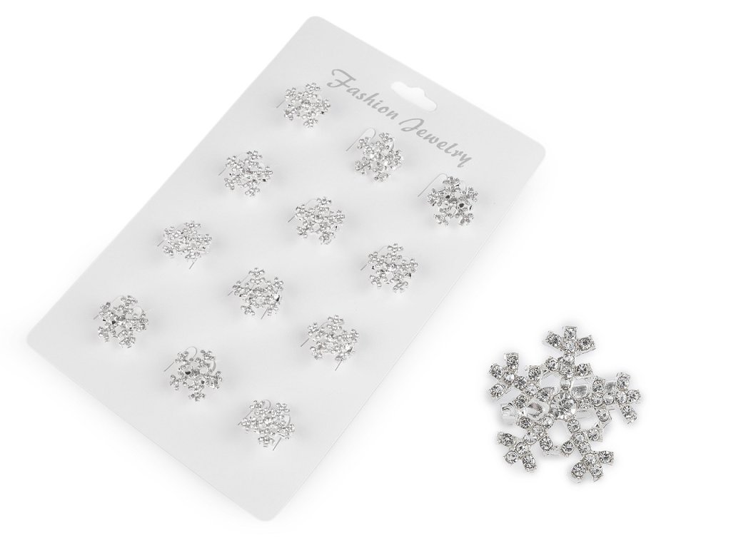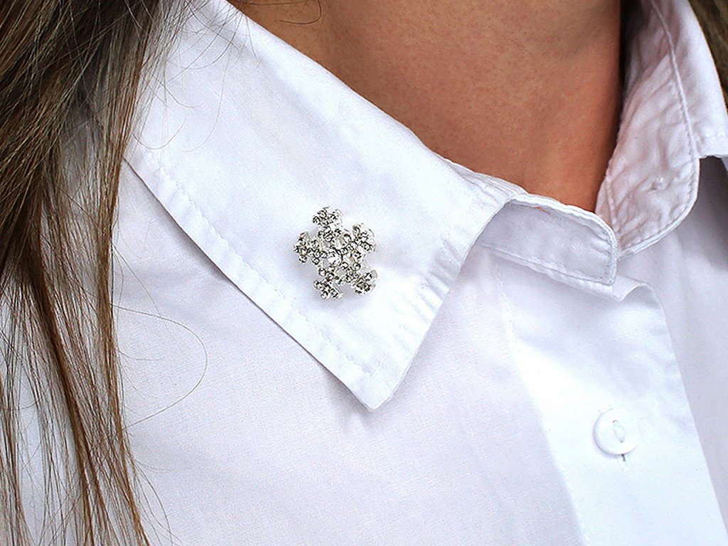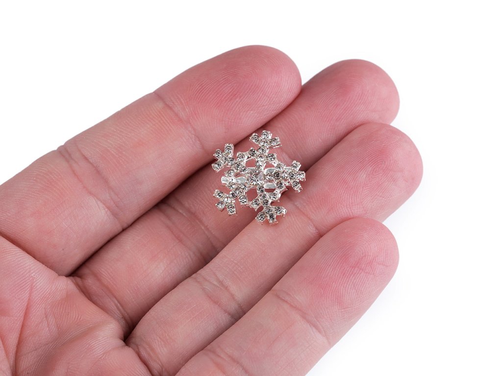 Elegantní mini brož s vločkou zaujme na první pohled svým jemným designem. Je osázená broušenými kamínky, které mají díky broušených plošek zajímavé světelné odlesky. Na zadní straně je brožový špendlík. Brož můžete nosit na oděvech, kloboucích, taškách či s ní můžete sepnout šátek.- Průměr: 1,8 cm