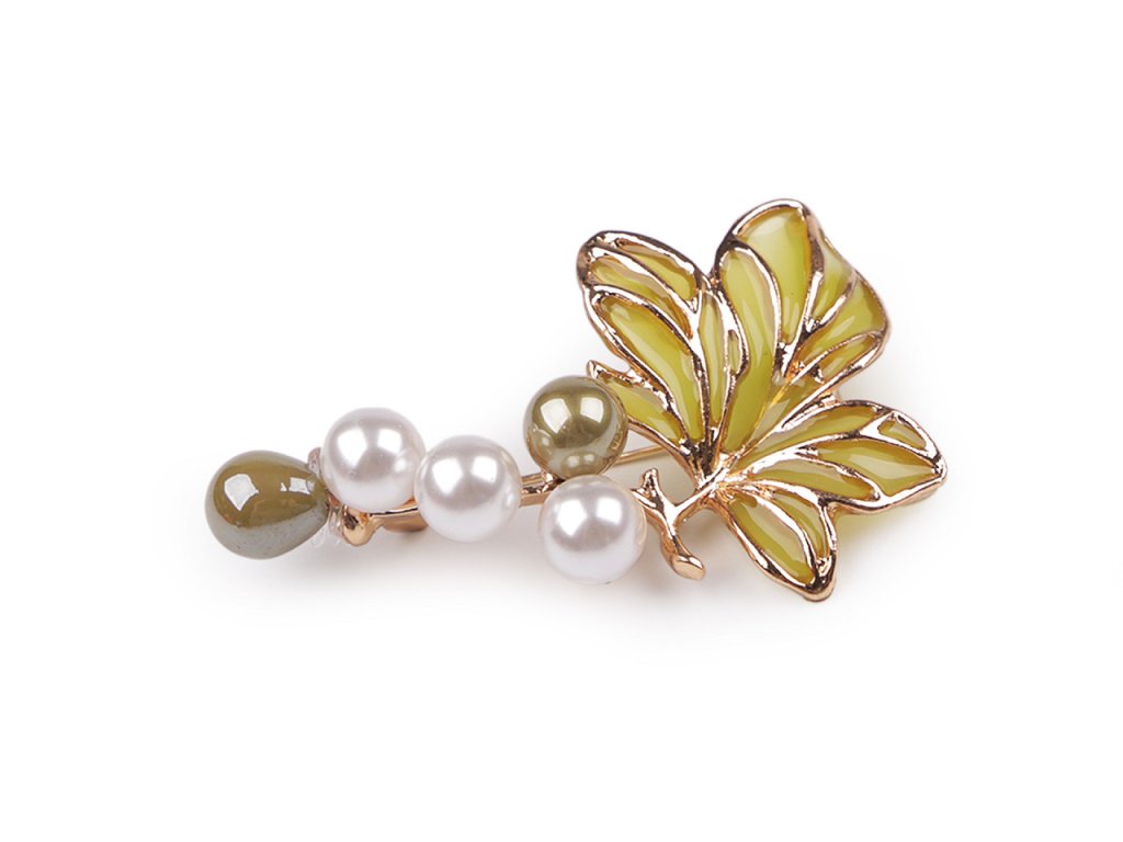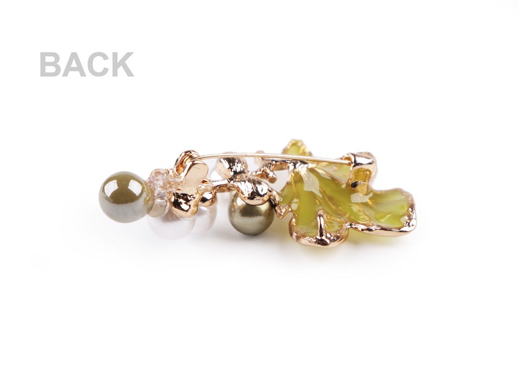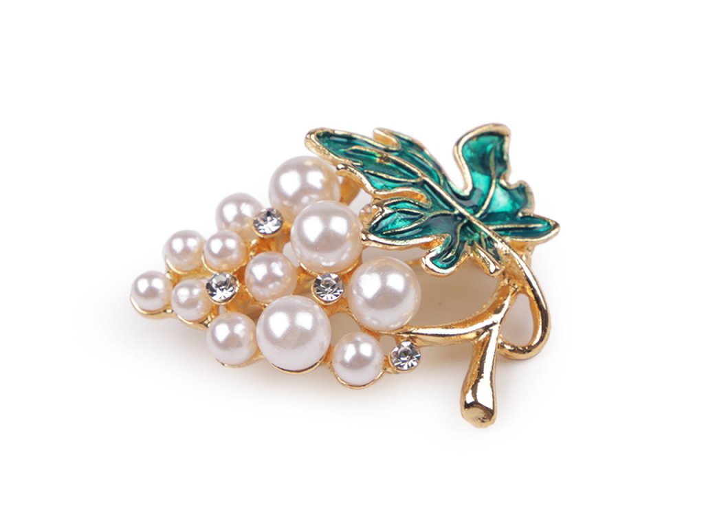 Brož s elegantním hroznem bude perfektním doplňkem vašeho oděvu. Díky perlám a barevnému smaltu skvěle dozdobí halenky, šaty, saka, svetry, kabáty, kabelky či čepice. Hodí se i na ozdobné sepnutí šátku. Brož má vzadu brožový špendlík. Je na plastové kartě, která se dá zavěsit na prodejní stojany.- Rozměry: č. 1: 3,2 x 5 cm