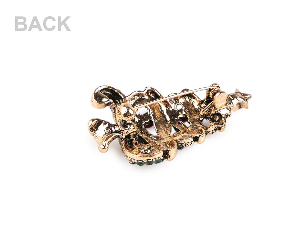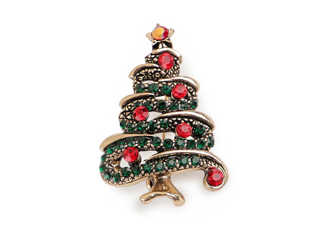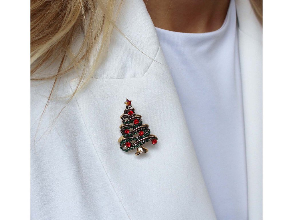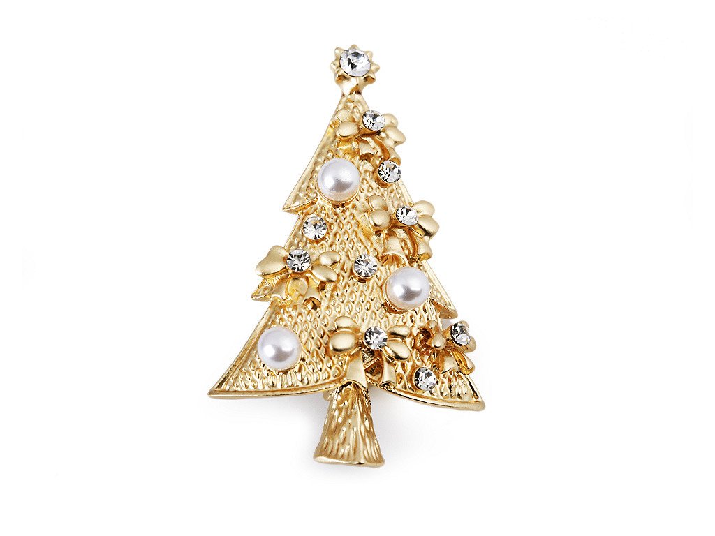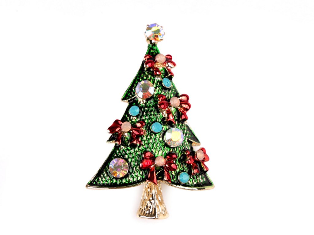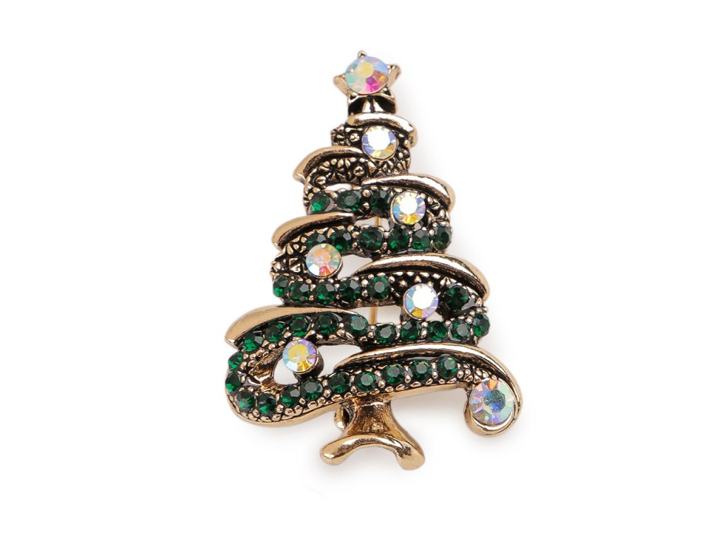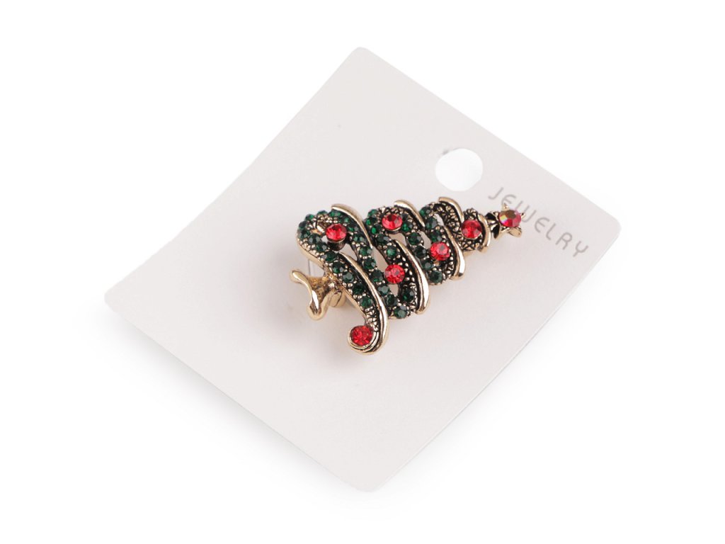 Elegantní brož vánoční stromeček působí starobylým, vintage dojmem. Je ozdobená broušenými kamínky, které se působivě lesknou. Využijete ji na společenské události - vánoční oslavy, večírky apod. Můžete ji nosit na oděvech, kloboucích, kabelkách nebo si s ní můžete sepnout šálu. Na zadní straně je brožový špendlík s pojistkou proti otevření. Brož je na plastové kartě, kterou lze zavěsit na prodejní stojany.- Šířka: 2,7 cm