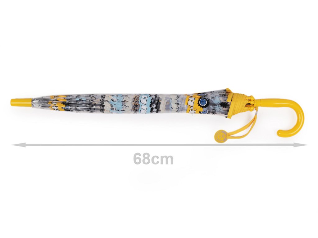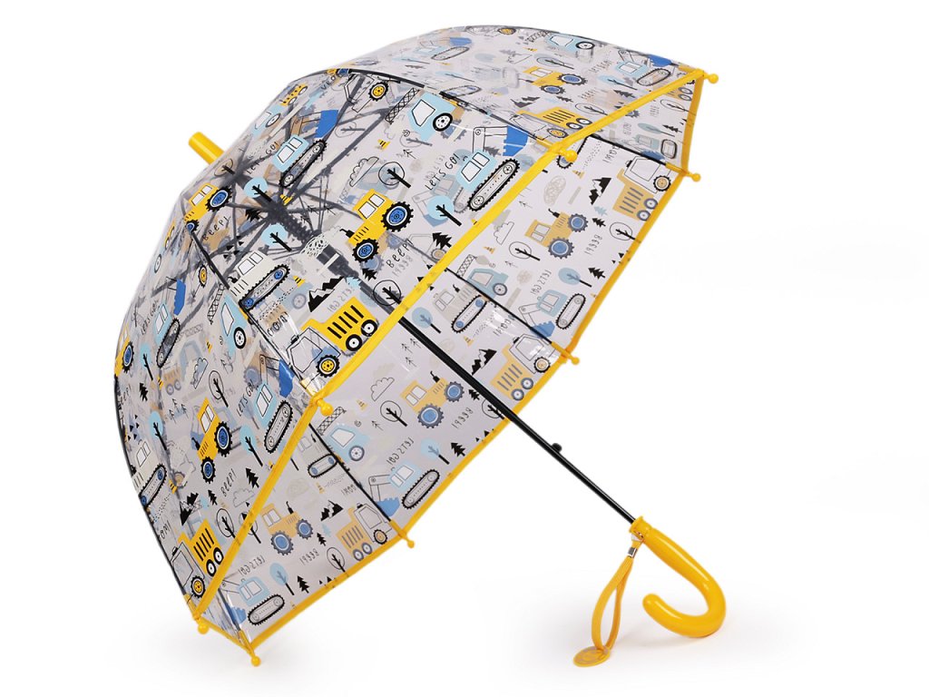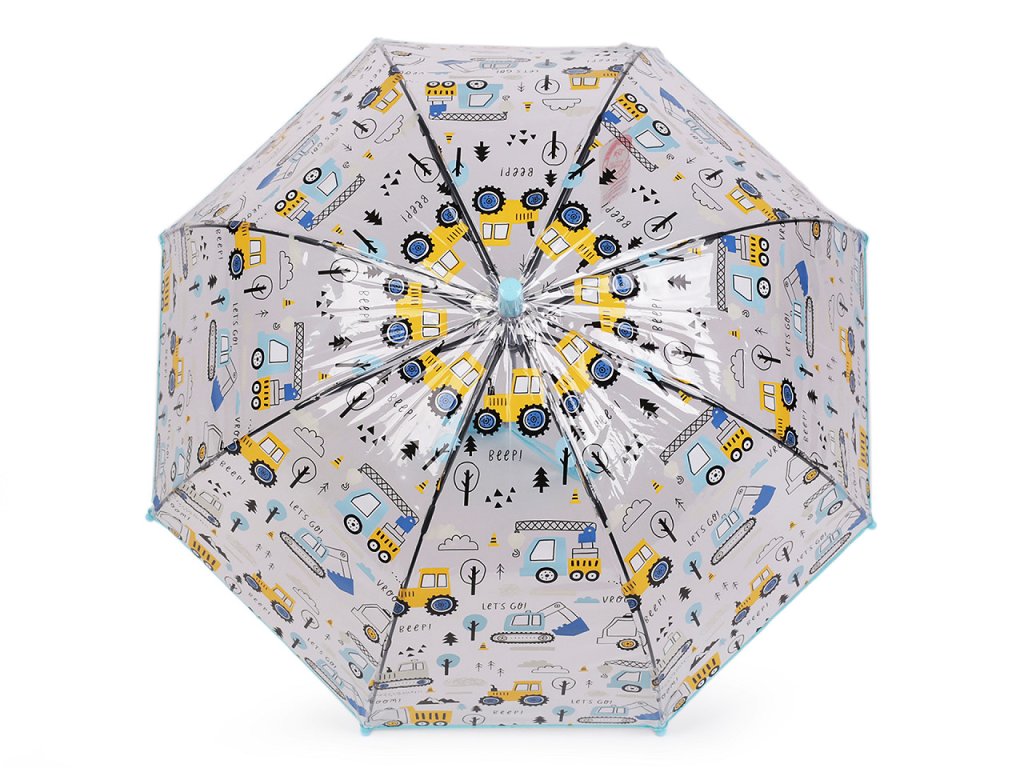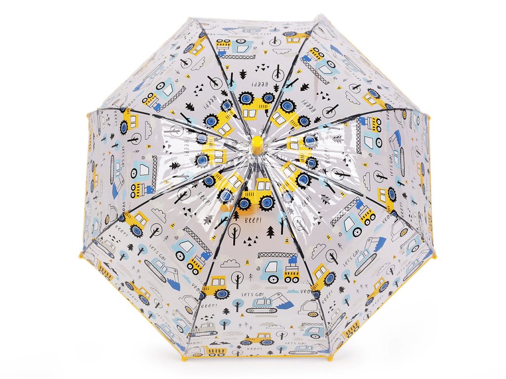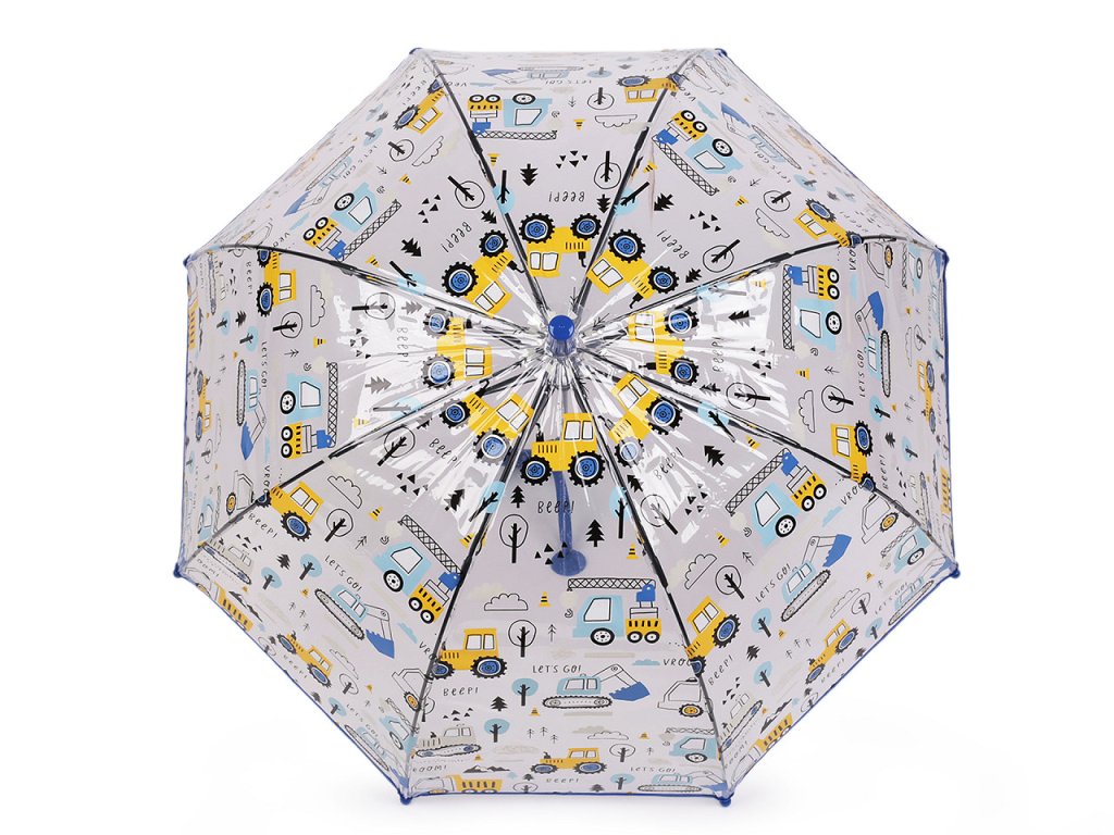 Dětský vystřelovací deštník s barevným potiskem autíček chlapce nadchne, protože díky průhlednému potahu uvidí ven. Navíc je dost hluboký, budou mít pocit, že jsou celí schovaní. Deštník je vystřelovací, má klasickou tyč zakončenou pevnou rukojetí. Konstrukce deštníku je z pružných lamel a tvoří osm polí. Konce lamel jsou zakončené plastovými kuličkami - zmenšují riziko poranění. Deštník má klasické zapínání na patentku. Hloubka deštníku je 30 cm.- Rukojeť: plastová