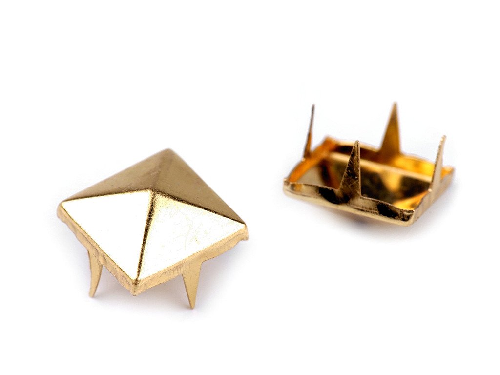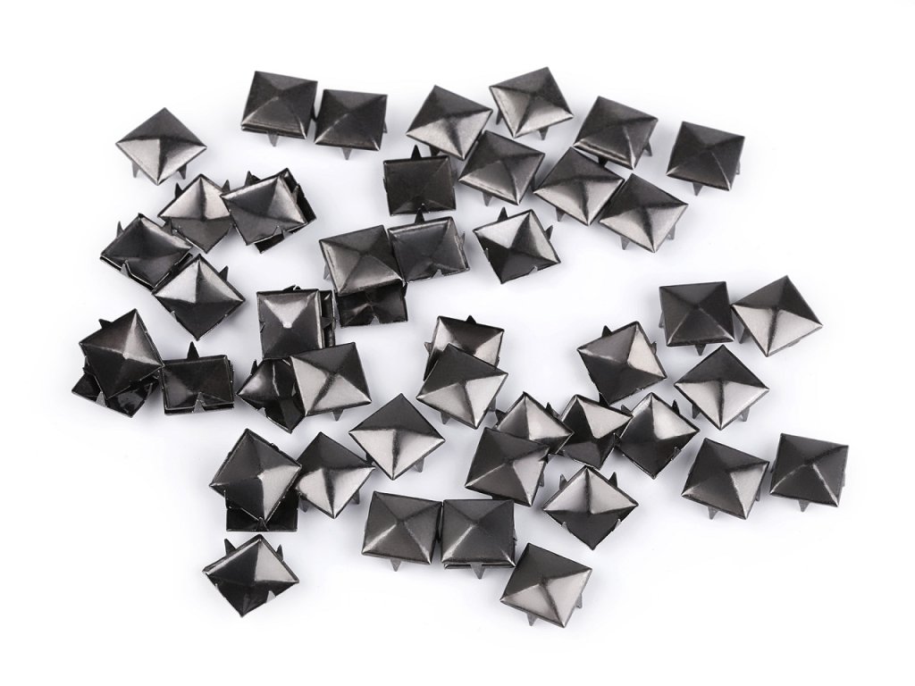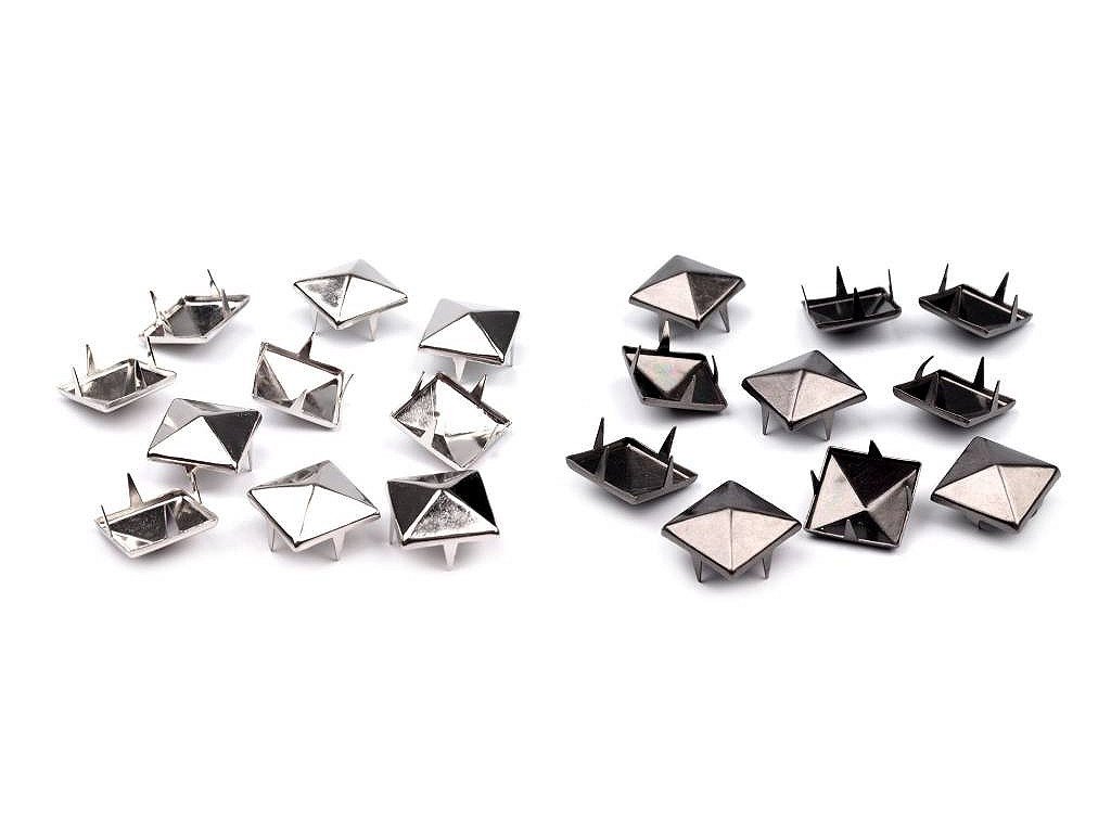 Kovové cvočky ve tvaru pyramidy jsou moderním doplňkem oblečení. Jistě jste je viděli na rockerském oblečení. Dnes se s nimi můžete také setkat např. na kabelkách, obuvi, šatech, peněženkách, atd. Cvočky jsou opatřeny nožičkami, které jdou ručně ohnout a jednoduše se tak připevní na látku. Oděv či módní doplněk s těmito ozdobami lze prát.Můžete zakoupit v balení po 50 ks. Rozměry cvočku jsou 12 x 12 mm, výška včetně hrotů 8 mm, výška bez hrotů 4 mm.- Rozměry: 12 x 12 mm