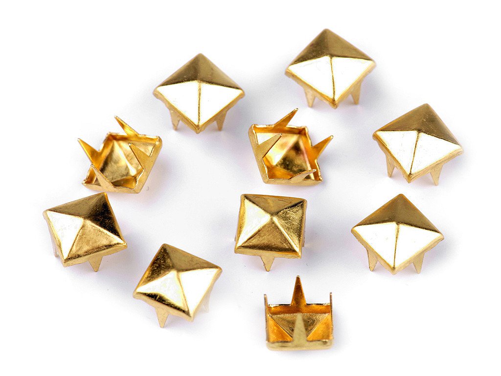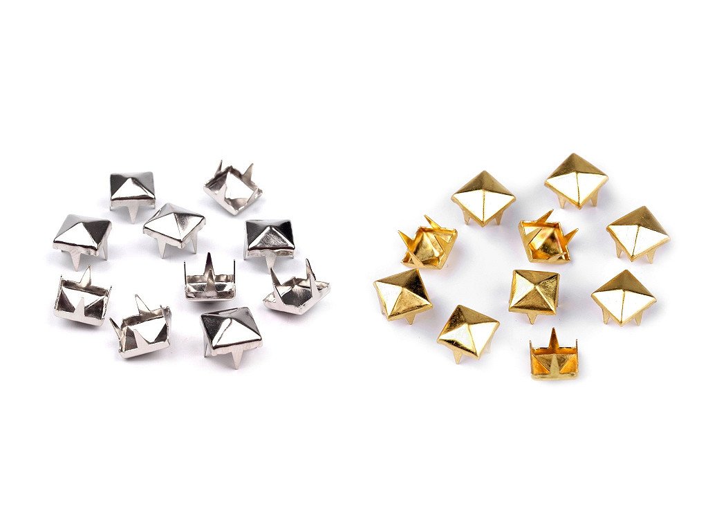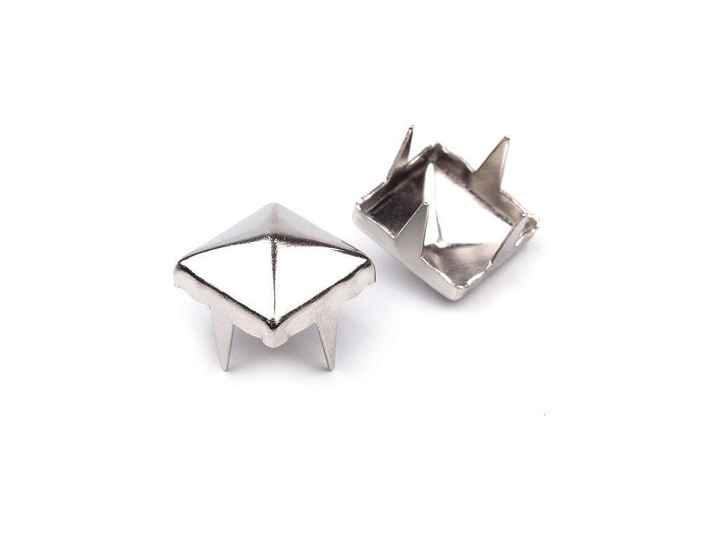 Kovové cvočky ve tvaru pyramidy jsou moderním doplňkem oblečení. Objevují se nejen na rockerském oblečení, ale můžete se s nimi setkat např. na kabelkách, obuvi, šatech, peněženkách, atd. Jsou vyrobené z kvalitní nerezové oceli. Cvočky jsou opatřené nožičkami, které jdou ručně ohnout a jednoduše se tak připevní na látku. Oděv či módní doplněk s těmito ozdobami lze prát. Můžete zakoupit v balení po 50 ks. Rozměry cvočku jsou 7 x 7 mm, výška včetně hrotů 7 mm, výška bez hrotů 4 mm.- Rozměry: 7 x 7 mm