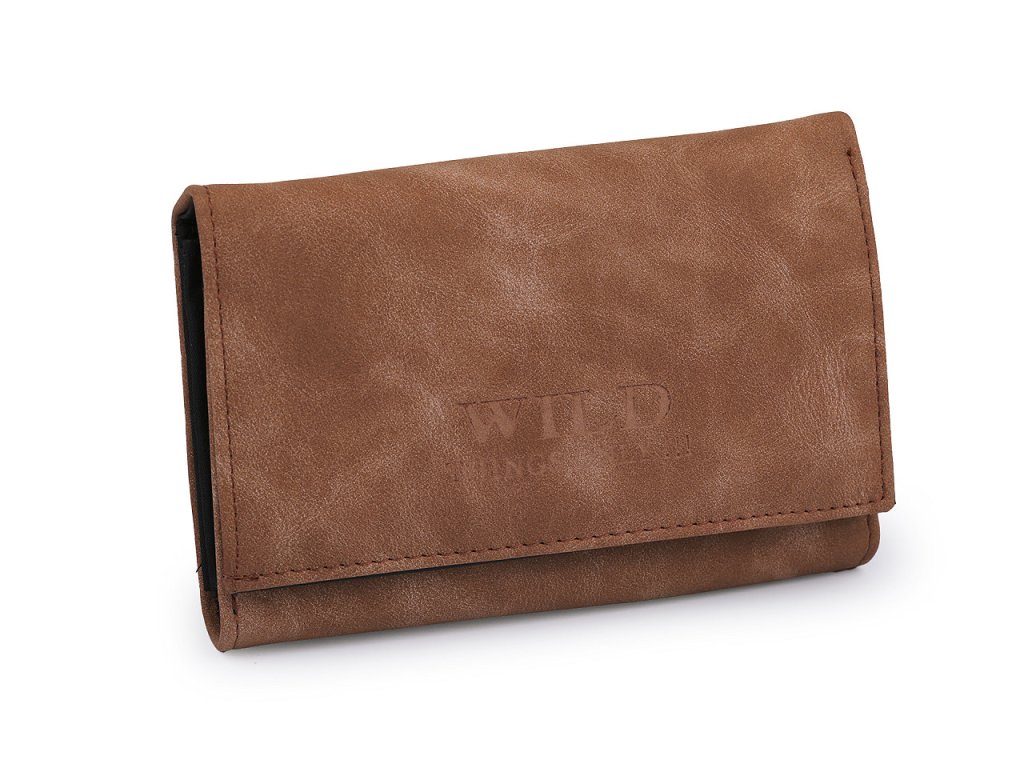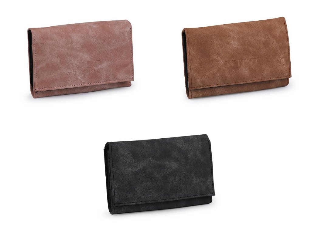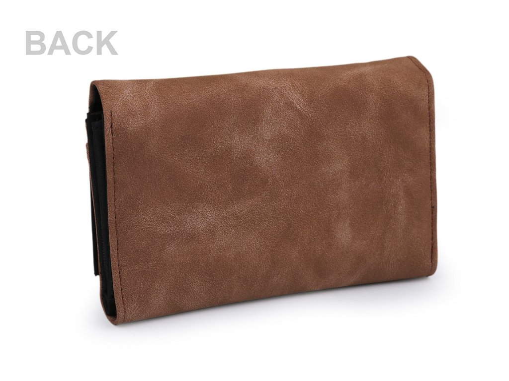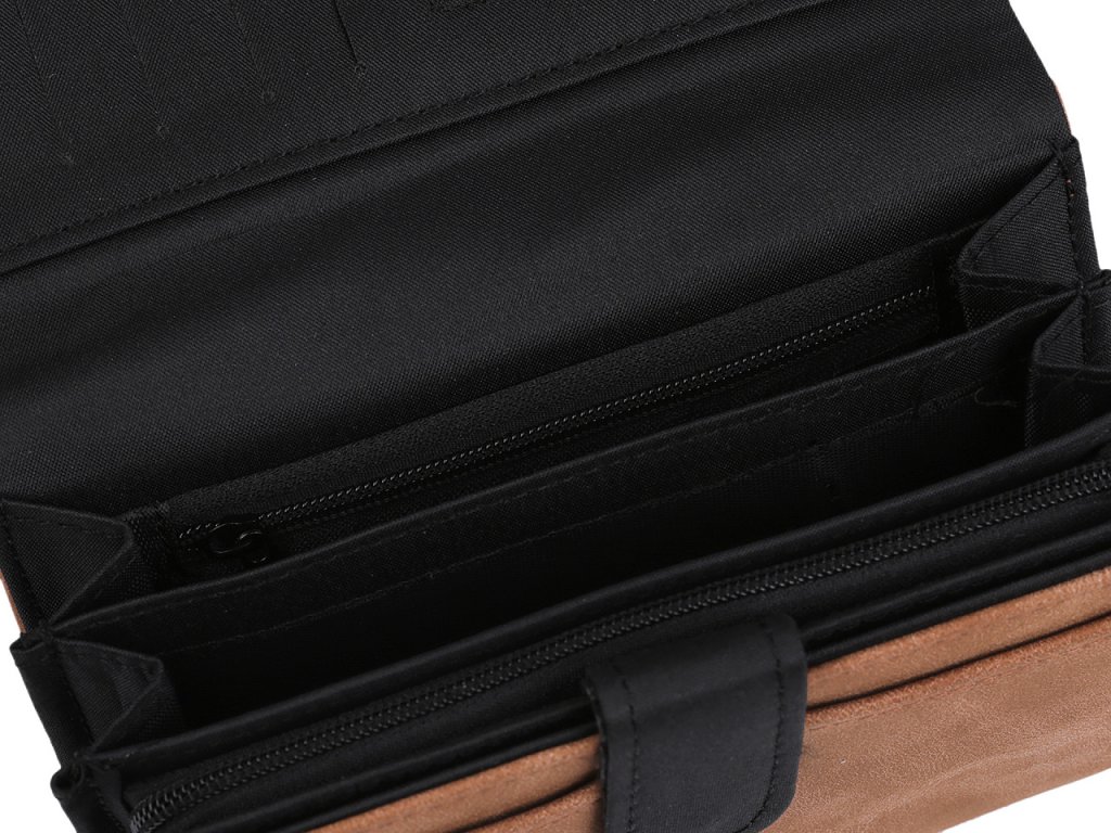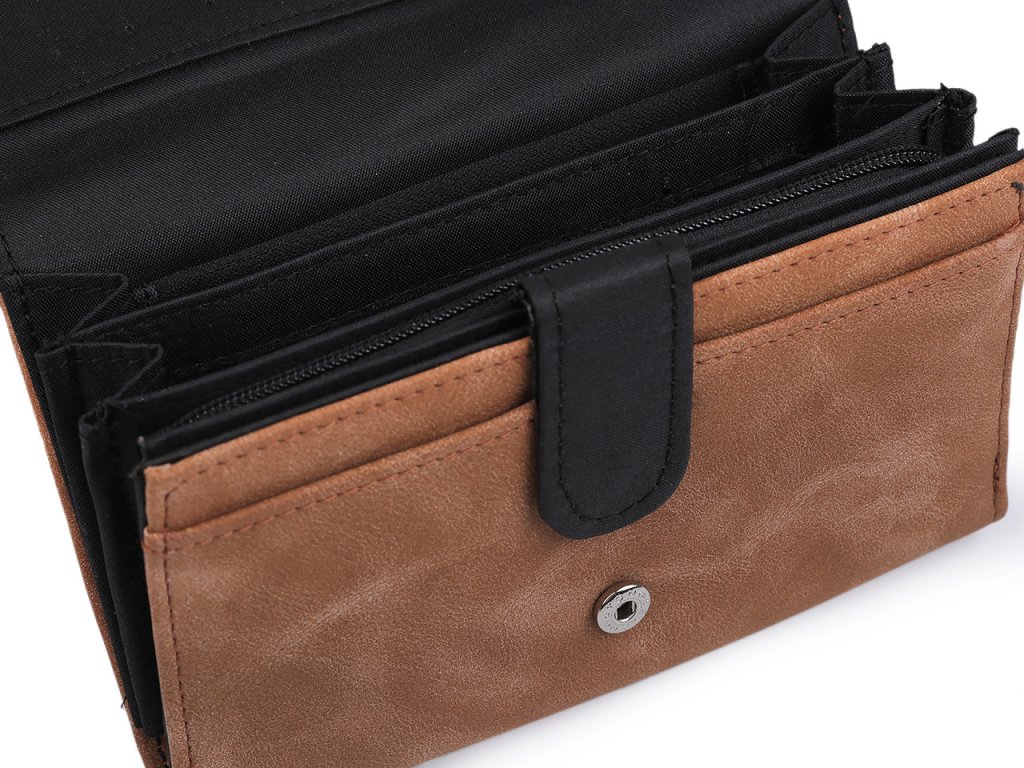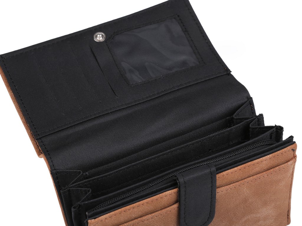 Dámská peněženka s designem ve vzhledu kůže má velice kvalitní provedení. Nadchne vás svým vnitřním uspořádáním se spoustou přihrádek a kapes. Zavírá se na klopu a patent. Uvnitř jsou 2 oddělené prostory. Po pravé straně jsou 4 přihrádky na karty, z toho je 1 průhledná. Pod nimi je 1 velká plochá kapsa. Uprostřed peněženky se nachází 2 kapsy na bankovky, v jedné je malá kapsička na zip. Vlevo je mincovník, který se zapíná na zip. Peněženka ukrývá ještě druhý oddíl, který se objeví po odepnutí zápinky na levé straně. Zde se nachází 6 přihrádek na kreditní karty a 5 plochých kapes.- Rozměry: 10 x 15 x 3 cm