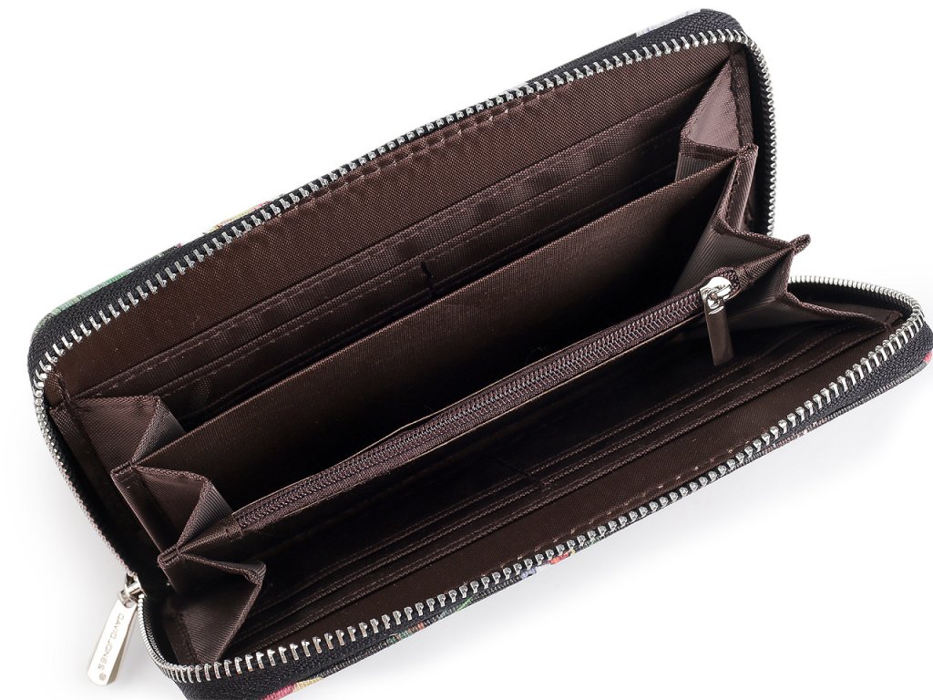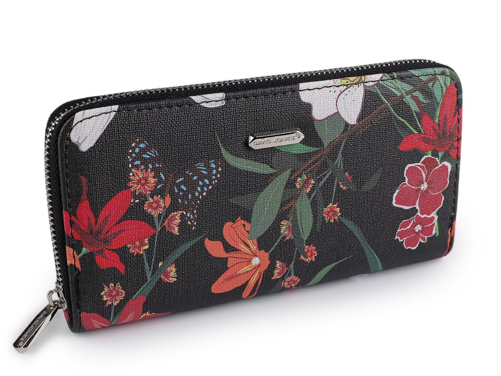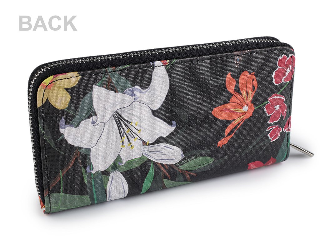 Dámská peněženka s motivem květů vás na první pohled okouzlí romanticky laděným potiskem. Vyniká kvalitním zpracováním, stane se vaší oblíbenou společnicí. Na přední straně má kovový štítek. Zapíná se na zip. Uvnitř se nachází tři přihrádky na bankovky a jedna kapsa s otvíráním na zip, sloužící k uschování mincí. Na vnitřních stranách peněženky pak najdete přihrádky k uložení karet či dokladů.- Rozměry: 10 x 19 x 2,5 cm