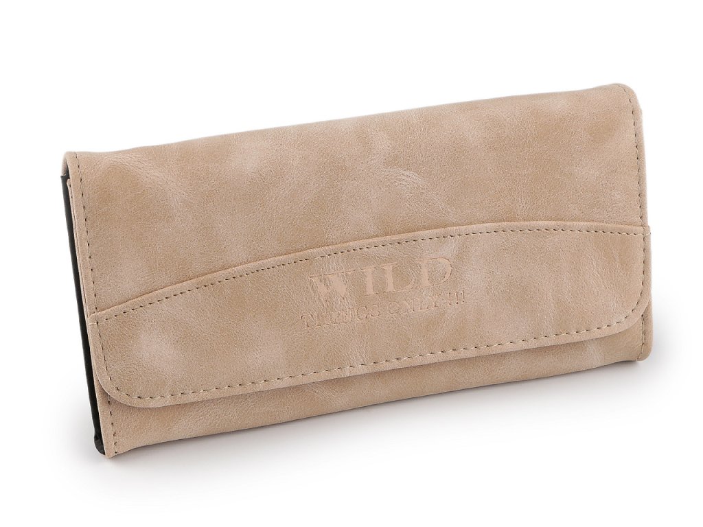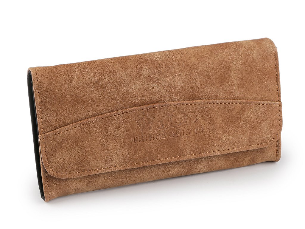 Dámská peněženka z broušené eko kůže má elegantní nadčasový design. Stane se vaší oblíbenou společnicí, snadno ji sladíte s jakýmkoliv stylem oblečení. Zavírá se na klopu a patent. Peněženka má celkem 4 přihrádky na karty, z nichž jedna je průhledná. Za ní jsou umístěné 2 dlouhé přihrádky, jedna z nich je na zip. Uprostřed peněženky se nachází 3 kapsy na bankovky, oddělené přepážkami. Vlevo je rozkládací mincovník rozdělený přepážkou na dva oddíly. Uzavírá se na zip.- Rozměry: 10 x 19 x 2,5 cm