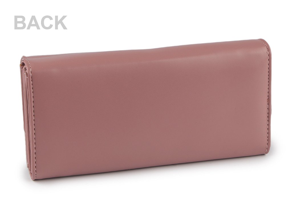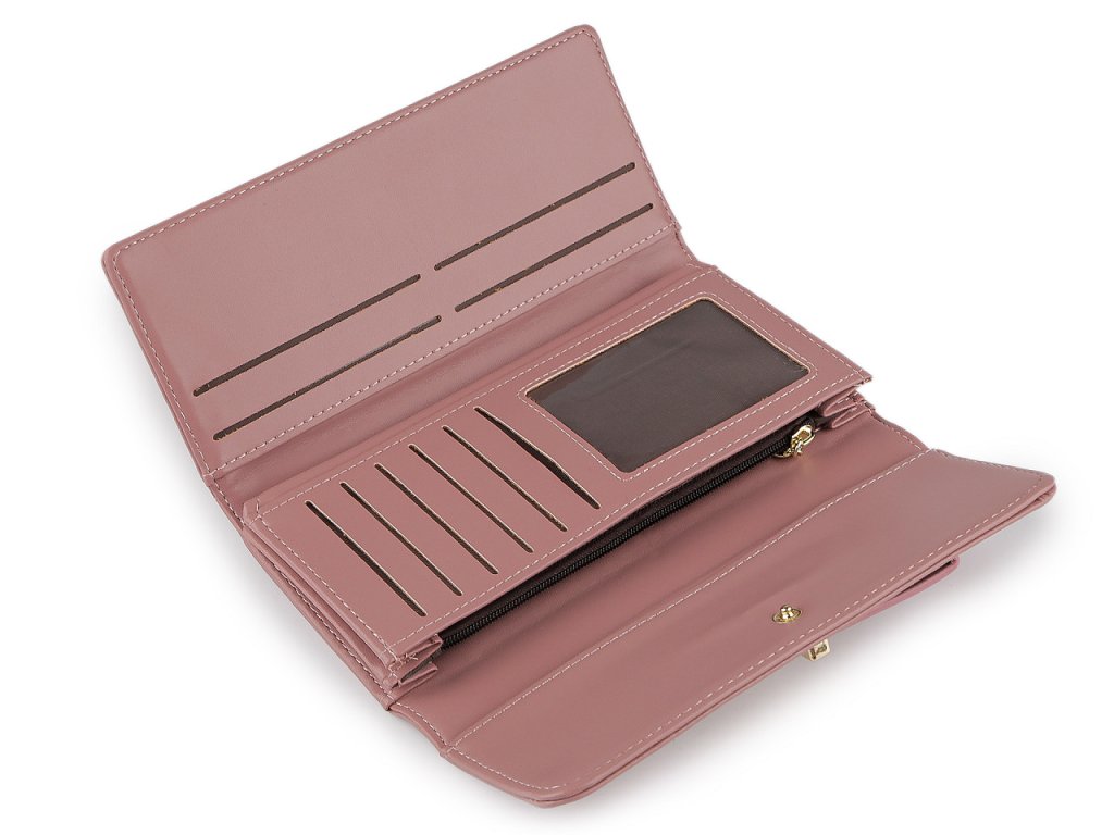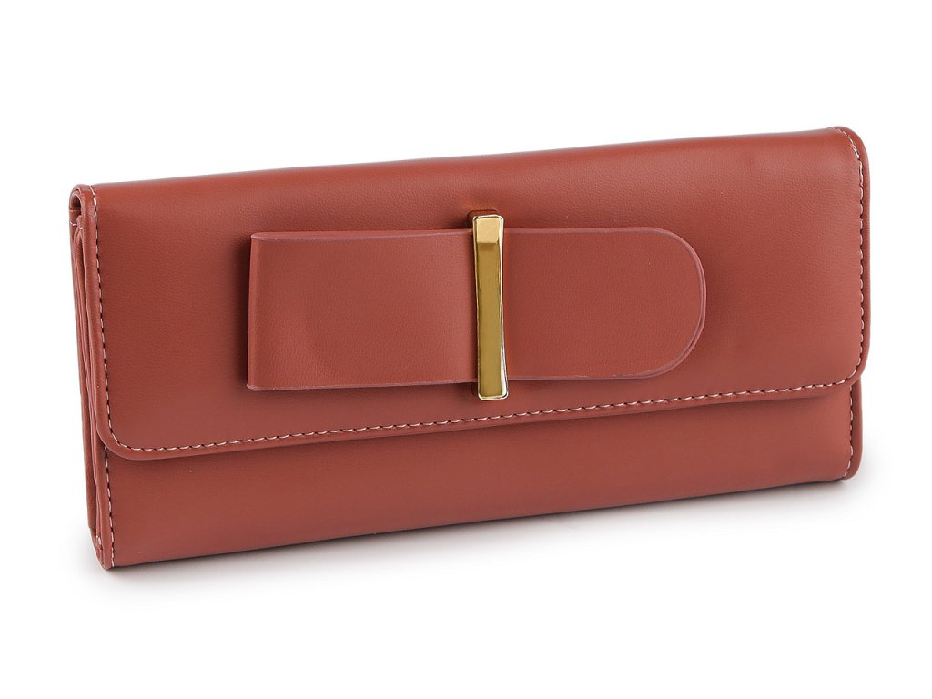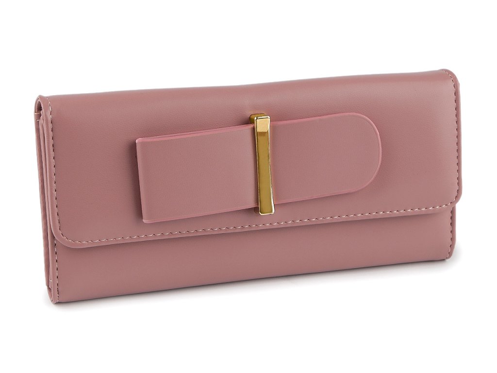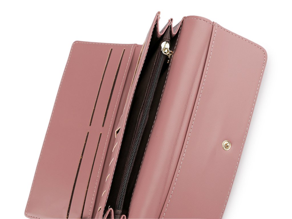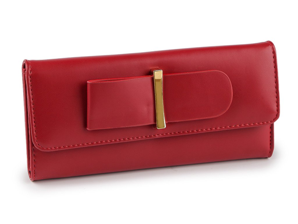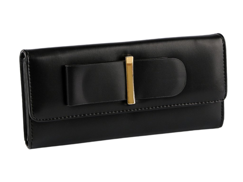 Dámská peněženka zaujme svým elegantním vzhledem. Přední stranu má ozdobenou designovou mašlí s kovovou sponou. Peněženka má velice kvalitní provedení z eko kůže. Zavírá se na klopu a patent. Peněženka má celkem 10 přihrádek na karty, z nichž jedna je průhledná a 1 dlouhá přihrádka na účtenky apod. Uprostřed peněženky se nachází 2 kapsy na bankovky, oddělené přepážkou, ve které je umístěný mincovník s uzavíráním na zip.- Rozměry: 9 x 19 x 3,5 cm