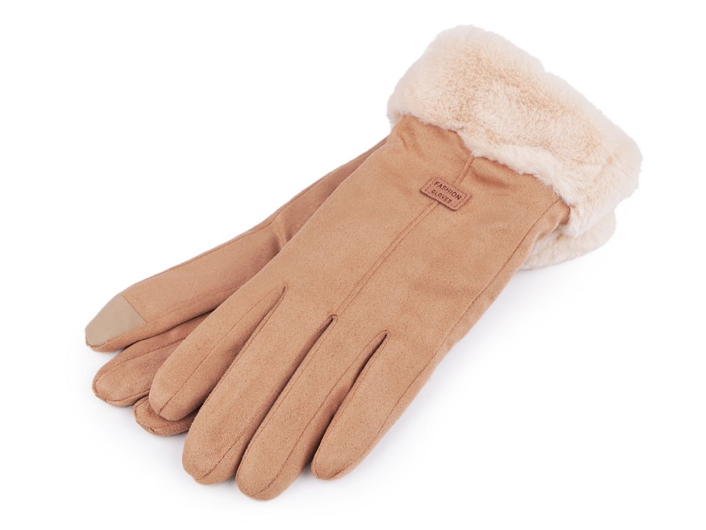 Elegantní dámské rukavice zdobí lem z umělé kožešiny a štítek s nápisem Fashion gloves. Rukavice jemně pruží, jejich povrch připomíná broušenou kůži. Uvnitř mají příjemný plyšový kožíšek. Hodí se do zimy i do chladnějšího podzimního počasí. Na ukazováčku pravé ruky je speciální tkanina, díky které můžete ovládat dotykové přístroje - mobil, tablet, bankomat apod. Šířka je měřená na volně položených rukavicích uprostřed (bez palce).- Šířka: 8,5 cm