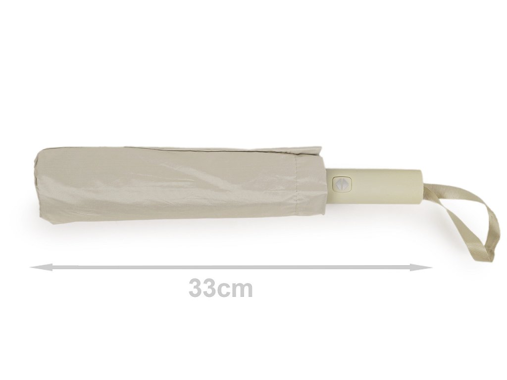 Plně automatický skládací deštník je vyrobený z kvalitního materiálu. Potah deštníku je jednobarevný, spodní potah je černý s uv filtrem. Deštník má vystřelovací / složitelný mechanismus. Rozevře i zavře se stisknutím tlačítka se šipkou nahoru nebo dolů. Rukojeť deštníku je plastová, opatřená poutkem. Konstrukce deštníku se skládá z dvanácti polí. Součástí deštníku je ochranný obal. Hloubka deštníku je 22 cm. Celková délka je 62 cm. Délka složeného deštníku je 33 cm.- Rukojeť: plastová