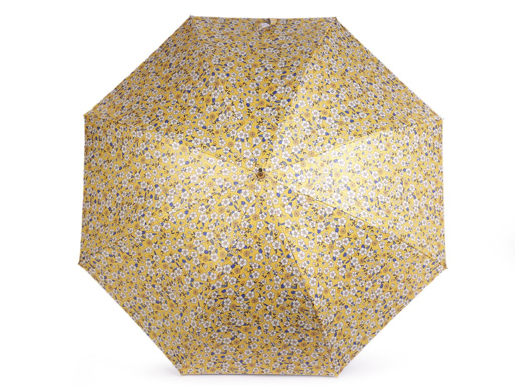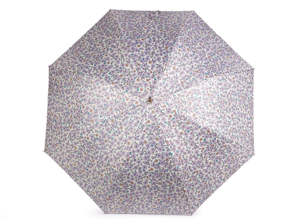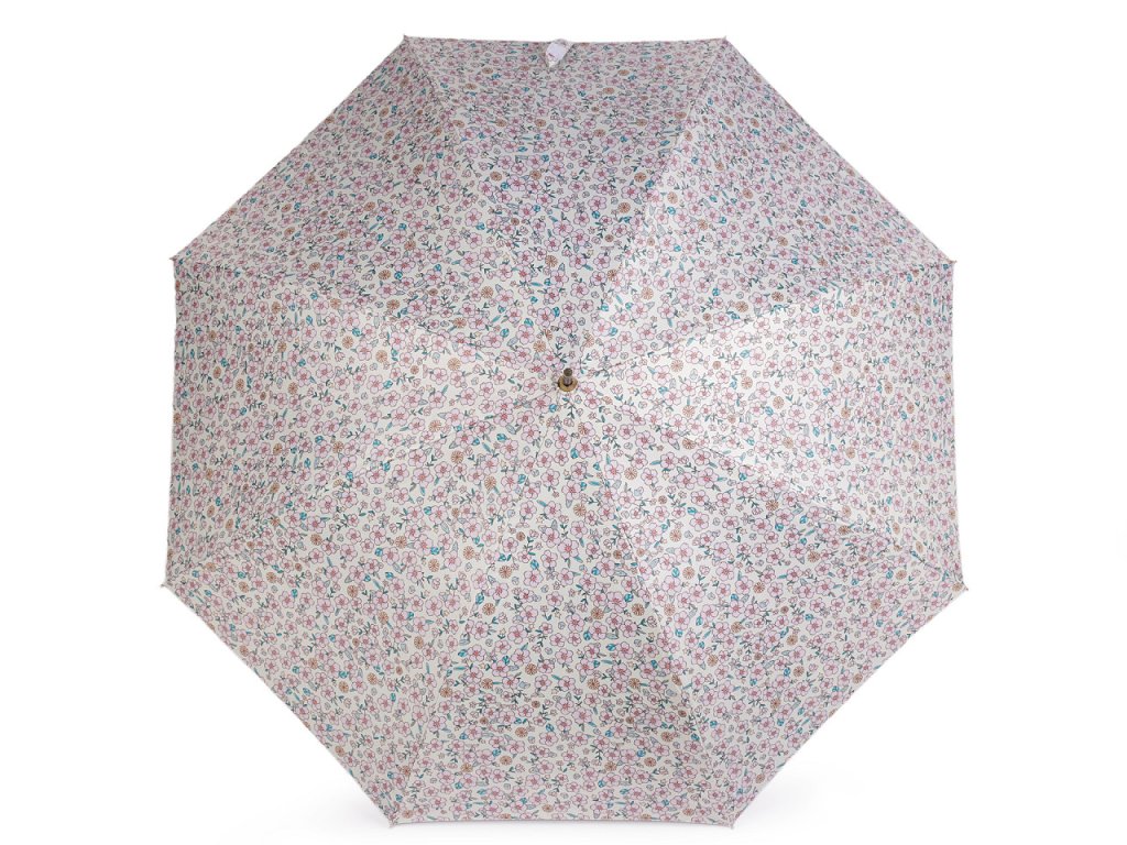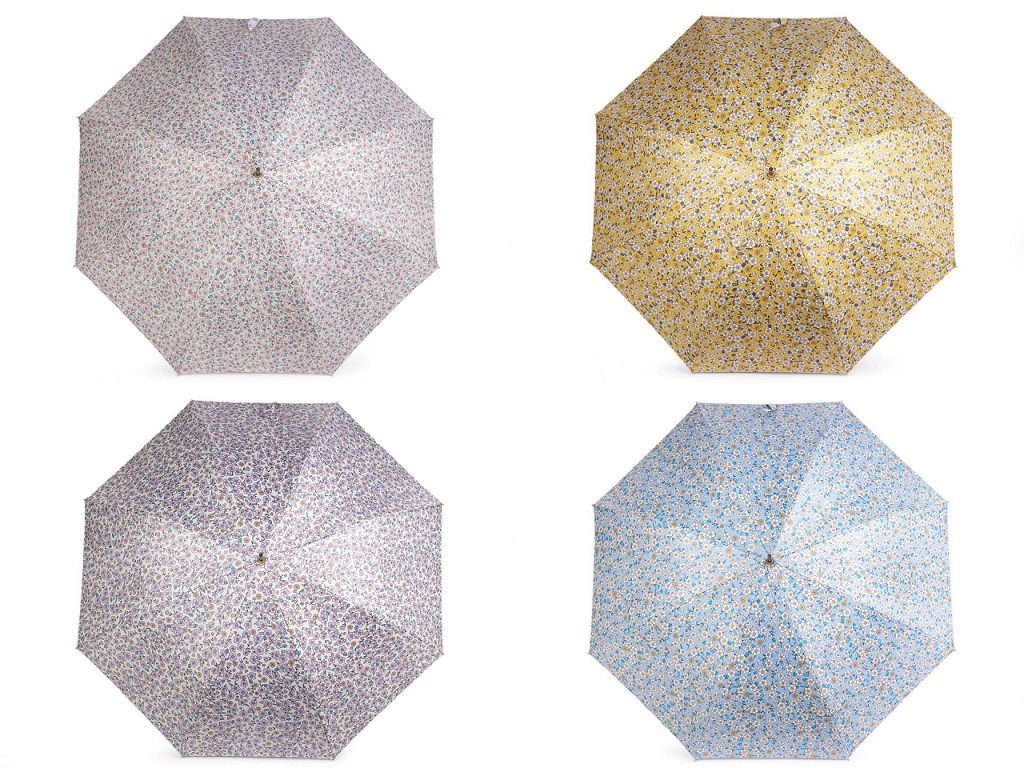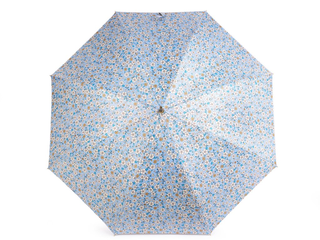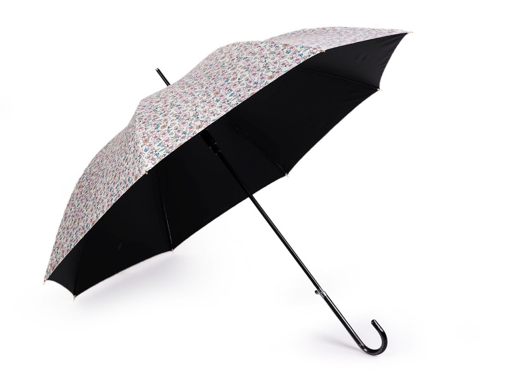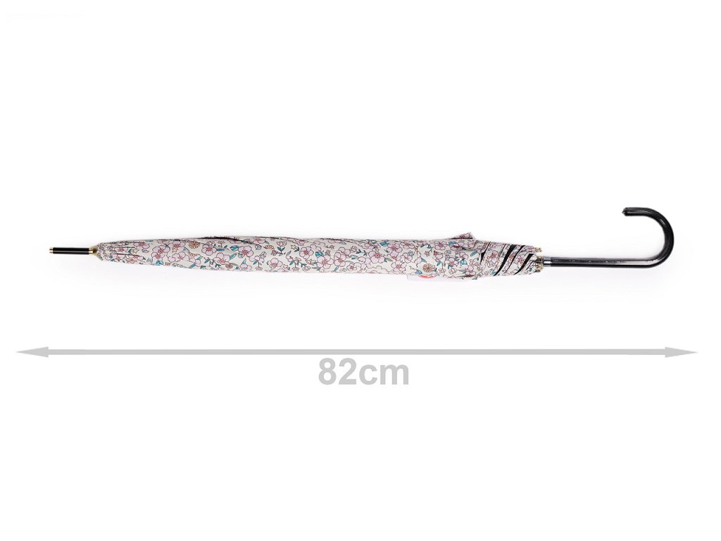Velký dámský deštník s potiskem květů je vystřelovací, konstrukci má z kovového drátu a pružných lamel, které tvoří osm polí. Díky nim je velice pevný, neohne se ani za největšího nečasu. UV filtr vás ochrání před slunečním zářením. Klasická tyč je zakončená pevnou rukojetí z eko kůže. Dolní strana potahu je černá. Hloubka deštníku je 24 cm.- Rukojeť: eko kůže
