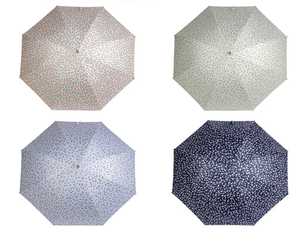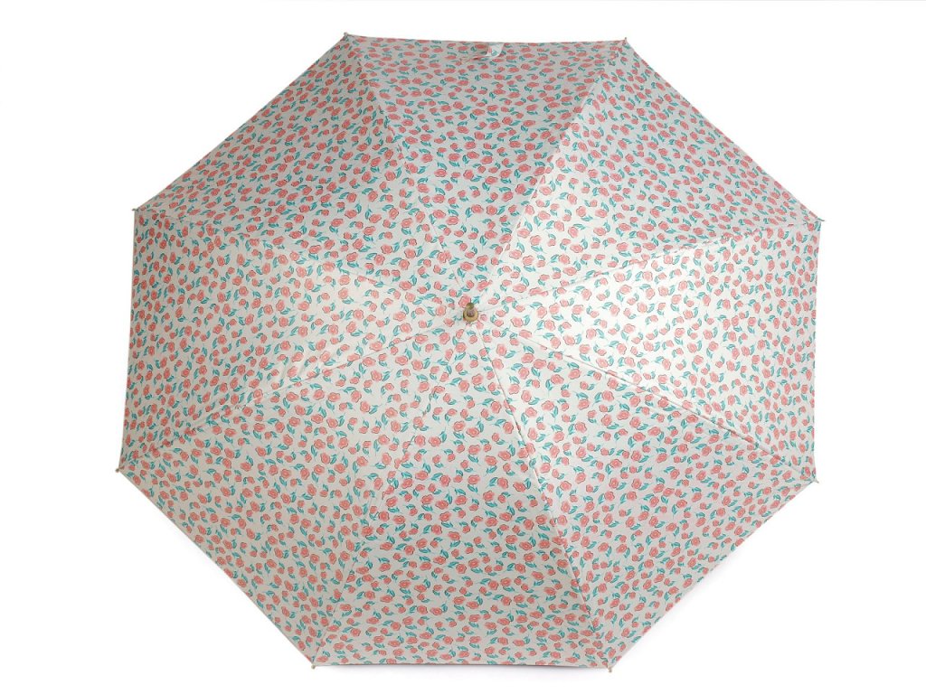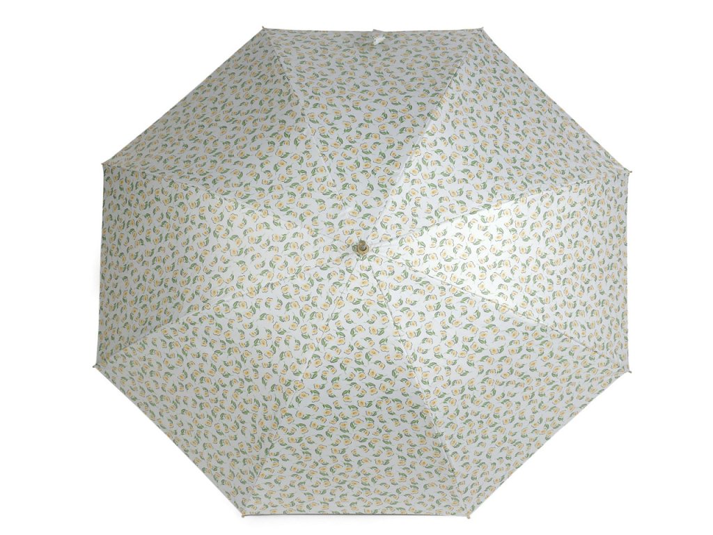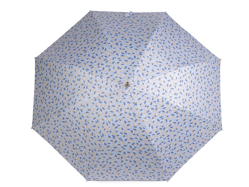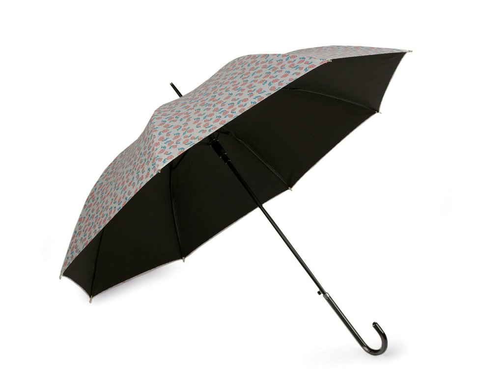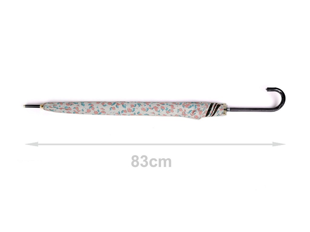 Velký dámský deštník s potiskem malých květů je vystřelovací, konstrukci má z kovového drátu a pružných lamel, které tvoří osm polí. Díky nim je velice pevný, neohne se ani za největšího nečasu. UV filtr vás ochrání před slunečním zářením. Klasická tyč je zakončená pevnou rukojetí z eko kůže. Dolní strana potahu je černá. Hloubka deštníku je 24 cm.- Rukojeť: eko kůže