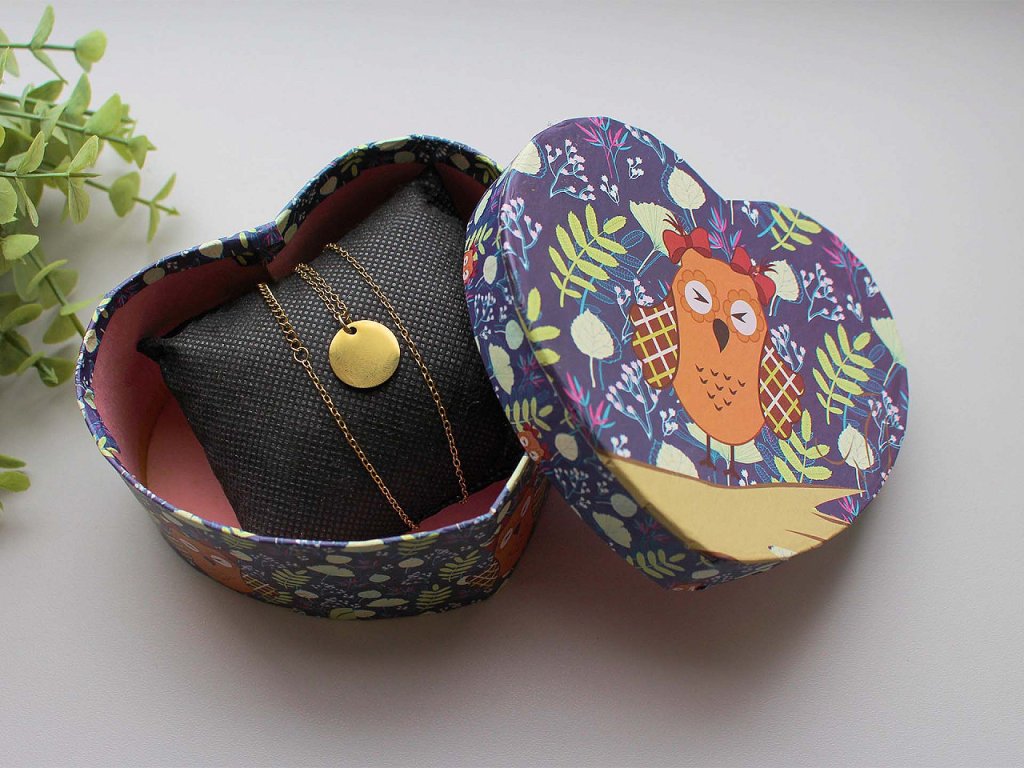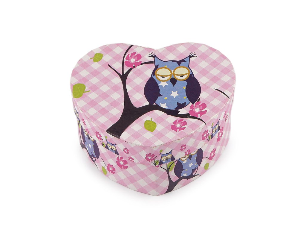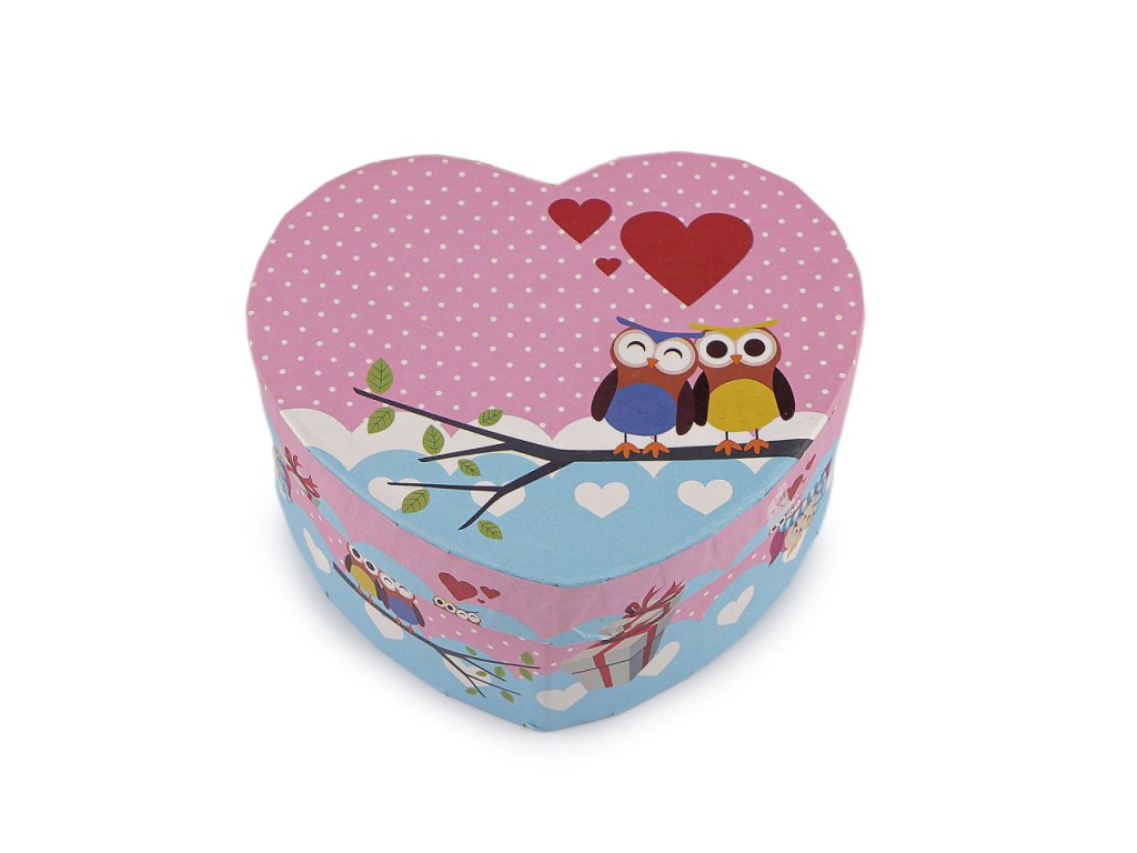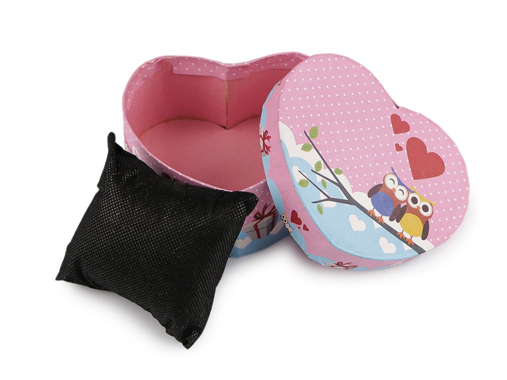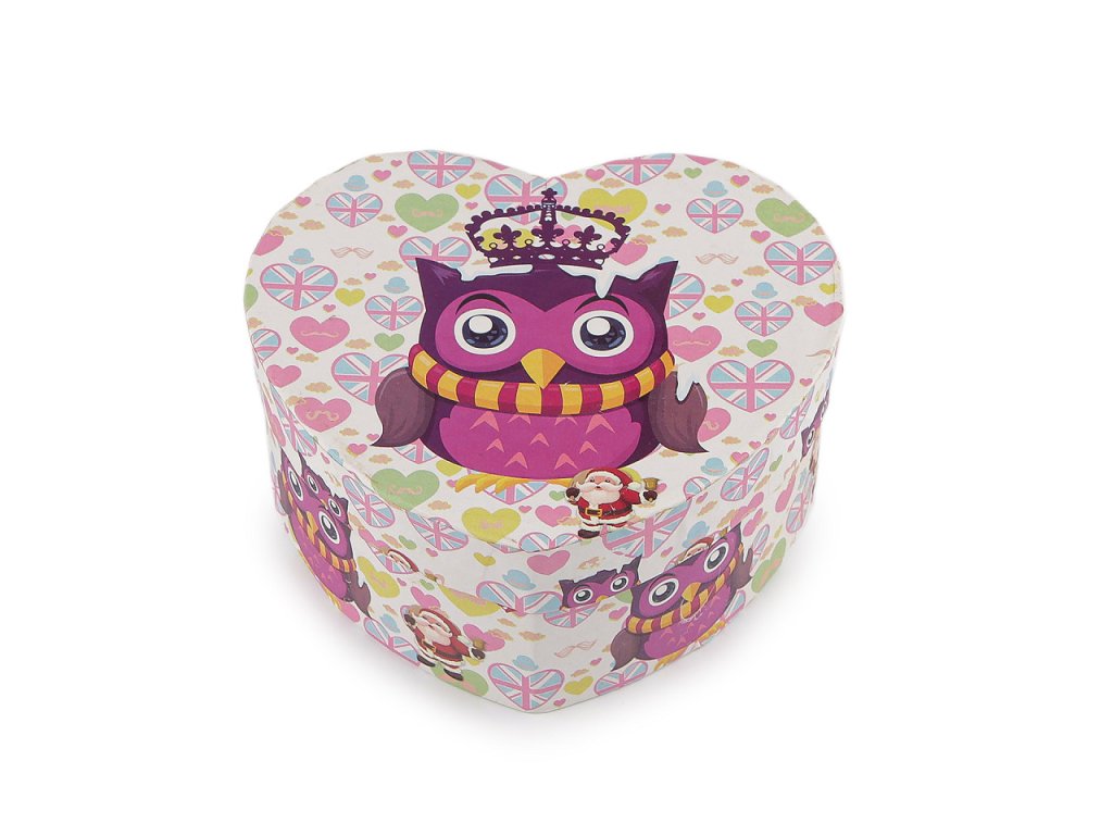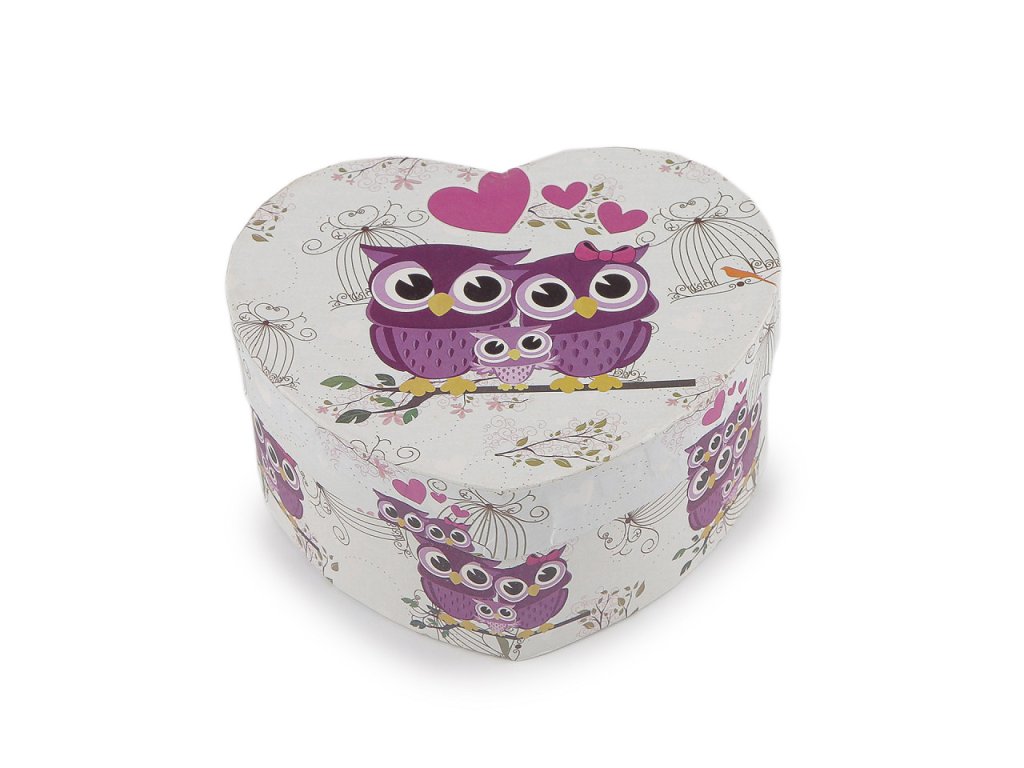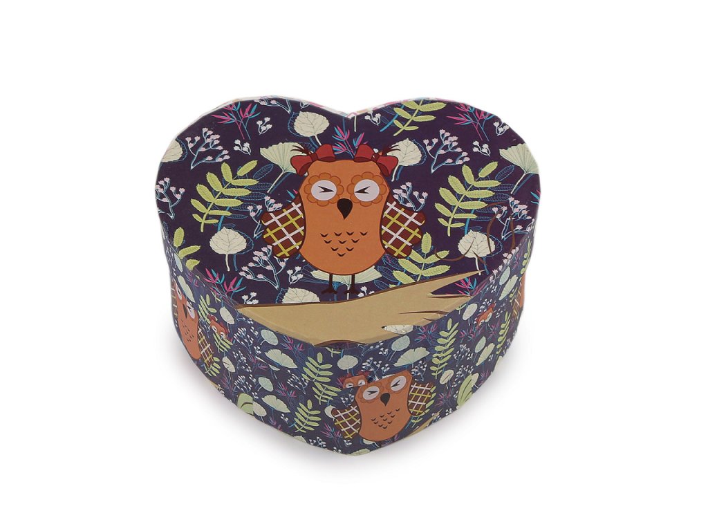 Papírová krabička ve tvaru srdce je ozdobená potiskem roztomilých soviček. Je určená na malé dárky, uvnitř má odnímatelný polštářek vhodný na darování hodinek nebo náramku. Krabička je velice pevná.- Rozměry: 11,5 x 10 cm