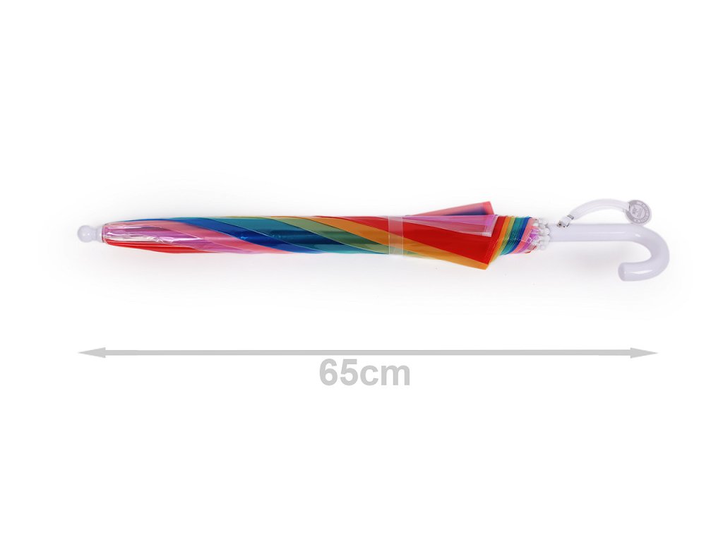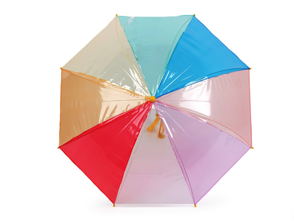 Dětský průhledný deštník s duhovým potahem má na rukojeti visačku, na kterou můžete napsat jméno dítěte. Má manuální otevírání a klasickou tyč zakončenou pevnou rukojetí. Konstrukce deštníku je z pružných lamel a tvoří osm polí. Lamely jsou zakončené plastovými koncovkami - zmenšují riziko poranění. Hloubka deštníku je 22 cm.- Rukojeť: plastová