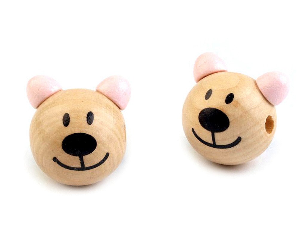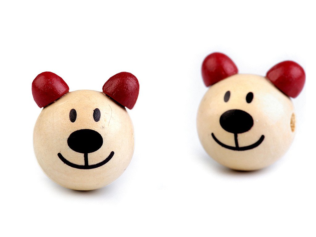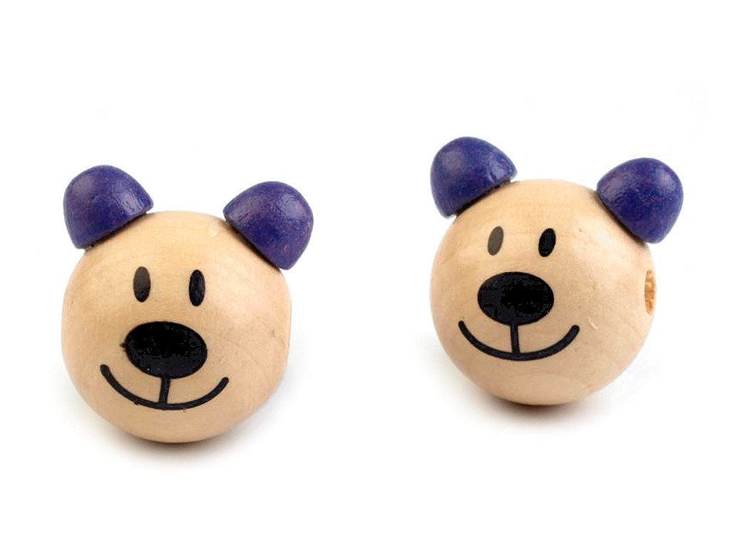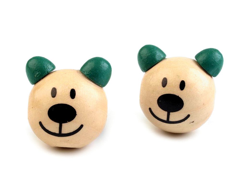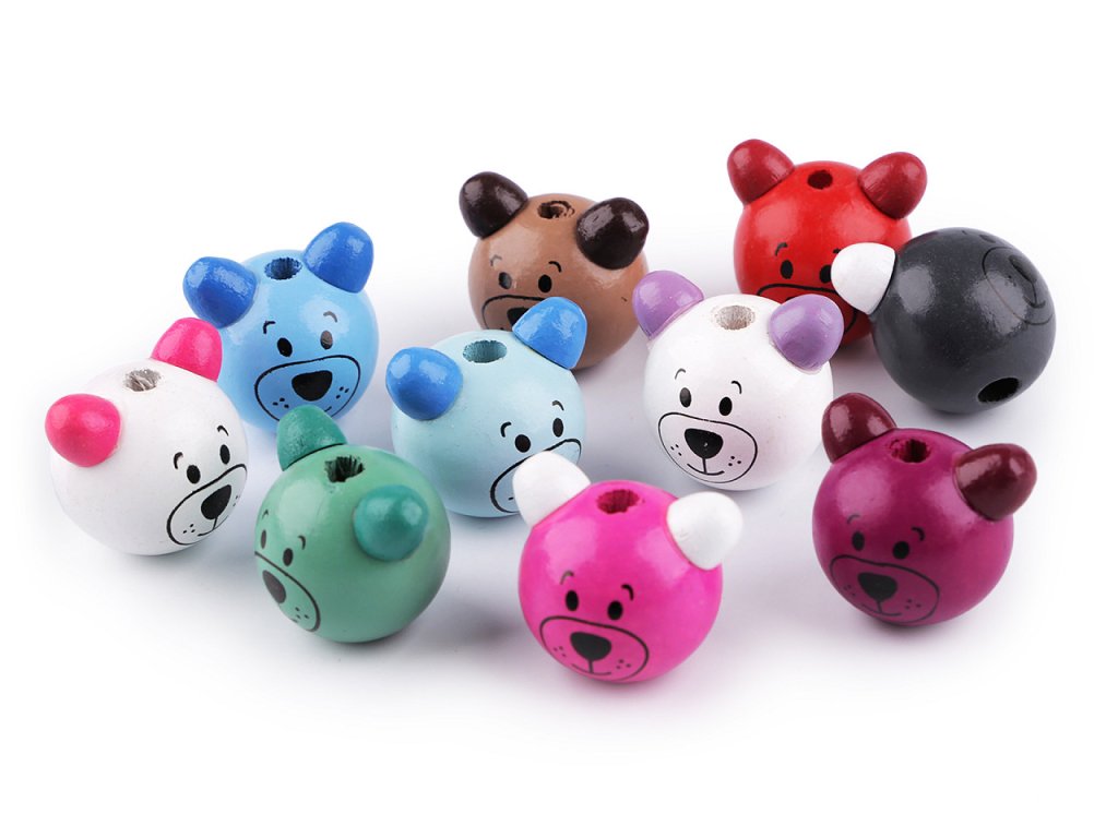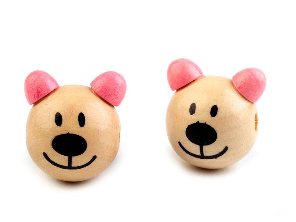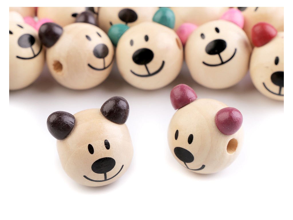 Dřevěné korálky medvědí hlavičky s barevnýma ušima jsou neodolatelné. Vesele oživí jakýkoliv náhrdelník. Můžete je s ostatními korálky navlékat na silon, tenkou voskovanou šňůrku nebo kůži. Šňůrky můžete zdobit i uzlíky, sami budete nadšeni z originálního náhrdelníku, který vám vznikne. Hlavičku můžete použít i jako samostatný přívěsek ke klíčům, kabelce apod. Potisk tváře je jen z jedné strany, průvlek je z boku korálku. U korálků č.4 se může vyskytovat několik odstínu fialově hnedé barvy. Nevhodné pro děti do 3 let. Mix nemusí obsahovat všechny dostupné barvy, vychystává se náhodně.- Průměr: 24 mm