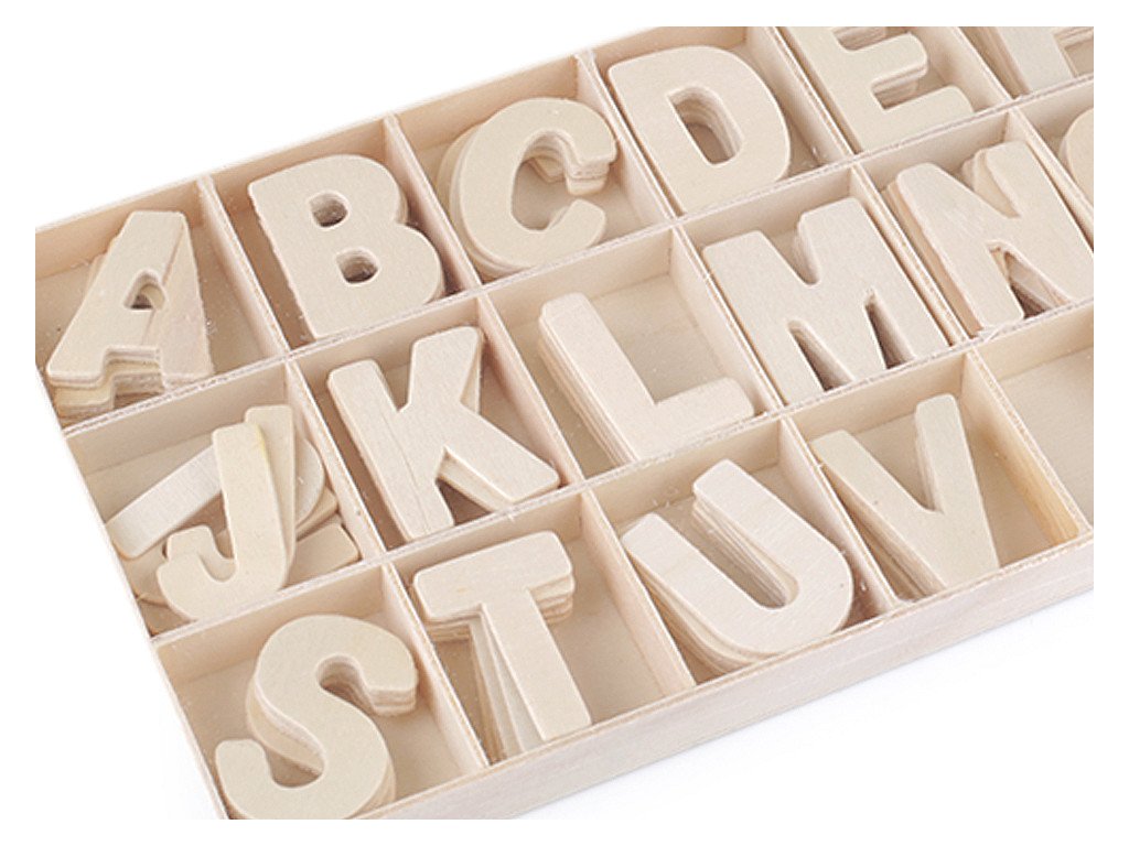 Dřevěná písmena v krabici zobrazují celou abecedu. Je oblíbená maminkami prvňáčků, s úspěchem ji používají jako zábavnou učební pomůcku. Hodí se k nalepení na přání, můžete s nimi ozdobit dveře dětského pokoje apod. Z rubu nemají samolepku, k přichycení můžete použít oboustrannou lepicí pásku nebo tekuté lepidlo. Abeceda i krabice je vyrobená z překližky, můžete je dále upravovat lakováním, mořením apod. Celá sada je vhodná na vystavení v prodejnách, písmenka jsou oblíbeným upomínkovým dárkem. Dekorace mohou sloužit jako polotovar při výtvarných technikách decoupage, scrapbooking apod. Tloušťka písmenek je 1,8 mm. Tloušťka překližky na krabici je 2 mm. U některých balení se může vyskytovat písmeno "N", které má háček na nožičce, ovšem ten se dá bez problémů odstřihnout. Na krabici se mohou objevit barevné skvrny.- Rozměry: 1,3 - 3 x 3,3 cm