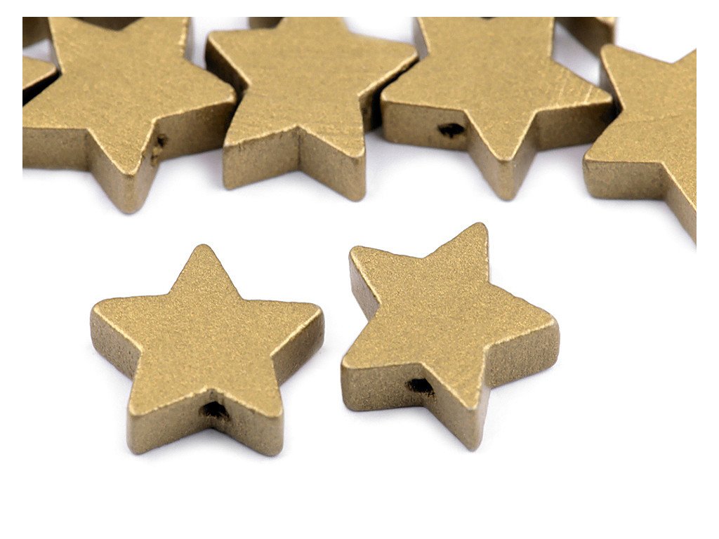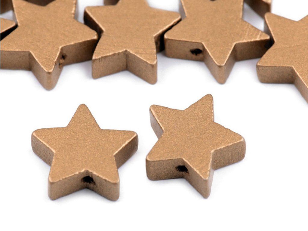Metalické dřevěné korálky ve tvaru hvězdy vnesou do vašich výtvorů moderní design. Můžete je navlékat na silon nebo jiný návlekový materiál. Korálky lze použít na výrobu náramků, náhrdelníků, náušnic nebo i na tvorbu přívěsků ke klíčům, kabelce apod.- Průměr: 19 mm