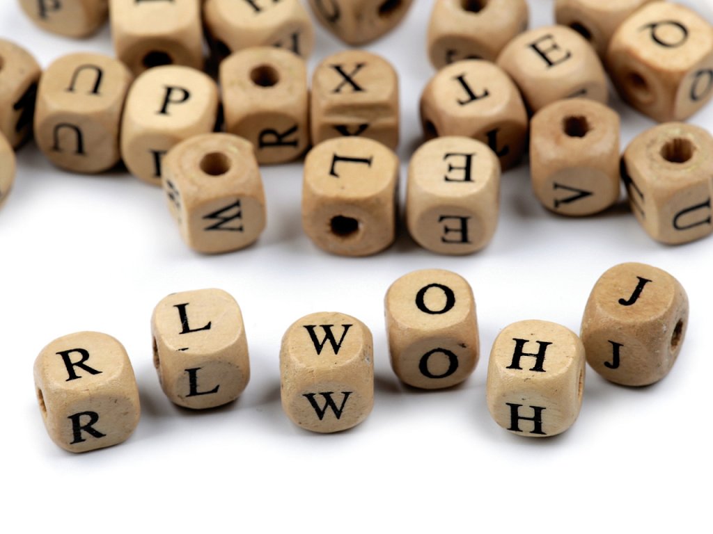 Dřevěné korálky kostky s potiskem písmenek. Písmena jsou na všech ploškách, chybí pouze na stranách s průvleky. Horizontálně umístěný průvlek umožňuje skládat z písmen slova, jména apod. Díky velkému průvleku se korálky hodí i na gumičkové náramky. Tělo korálku má přírodní barvu, písmena jsou černá. Jako návlekový materiál můžete použít pruženky a silony, různé šňůrky, gumičky apod. V sáčku je mix různých písmen. Sáček nemusí obsahovat všechny kombinace písmen z abecedy, jednotlivá balení se od sebe mohou lišit. Písmenka jsou z anglické abecedy, tudíž bez diakritických znamének. 2.jakost je z důvodu křivě natisknutých písmenek, některá mohou být místy rozpitá.- Rozměry: 10 x 10 x 10 mm
