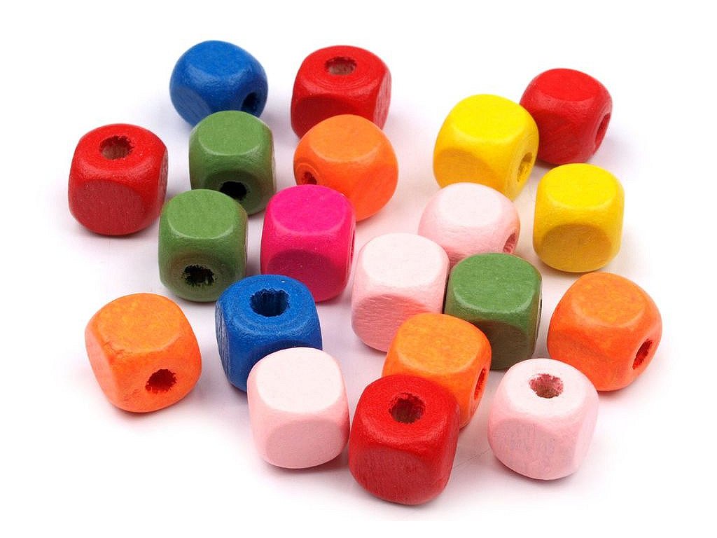 Lehký a velice oblíbený materiál. Kostky stačí navléci na pruženku, kloboukovou gumičku nebo paměťový drát a veselý náramek je během chvilky na světě. Nebo použijte na návlek voskovanou šňůrku, kterou můžete zdobit i uzlíky a sami budete nadšeni z originálního náhrdelníku, který vám vznikne. Fantazii se meze nekladou. V balení 500 g je cca 1100 ks korálků. Korálky jsou ve 2. jakosti, mohou se u nich vyskytovat otřepy v průvleku viz foto. Větší otřepy lze začistit hrotem nůžek. Není to důvod k reklamaci.- Rozměry: 10 x 10 mm
