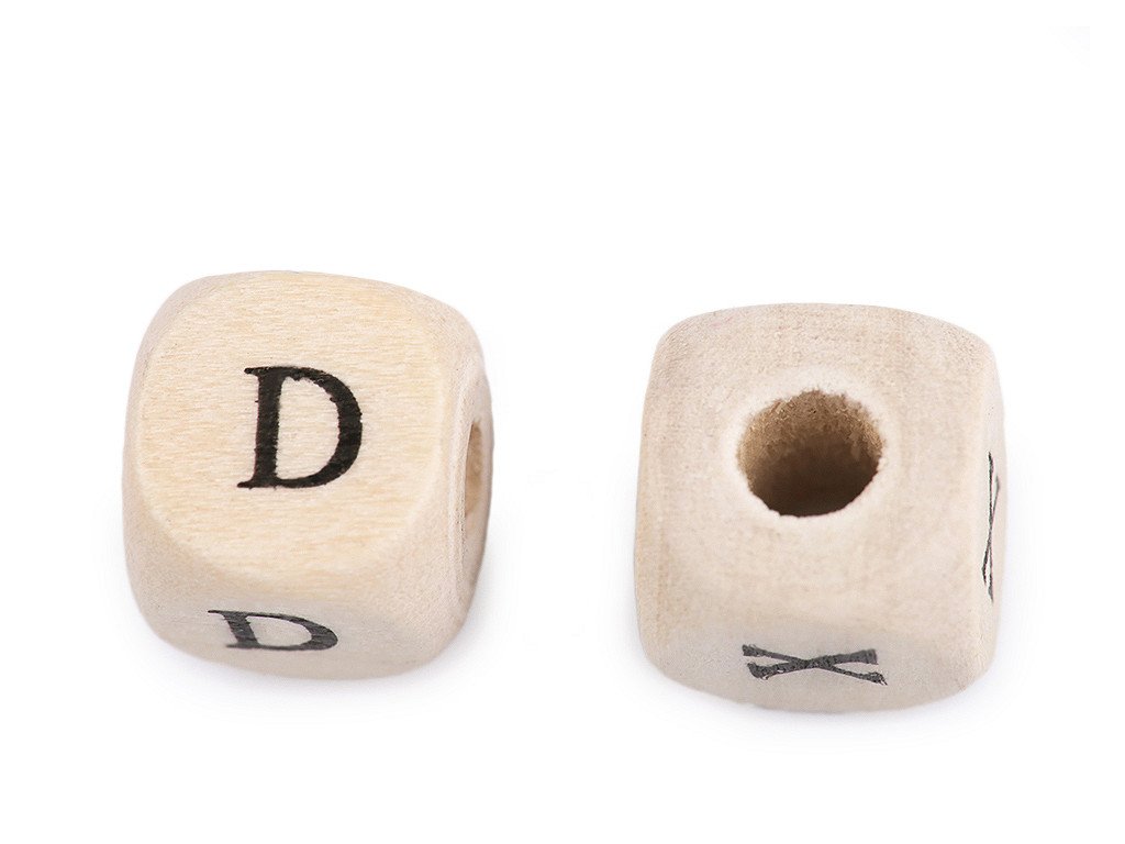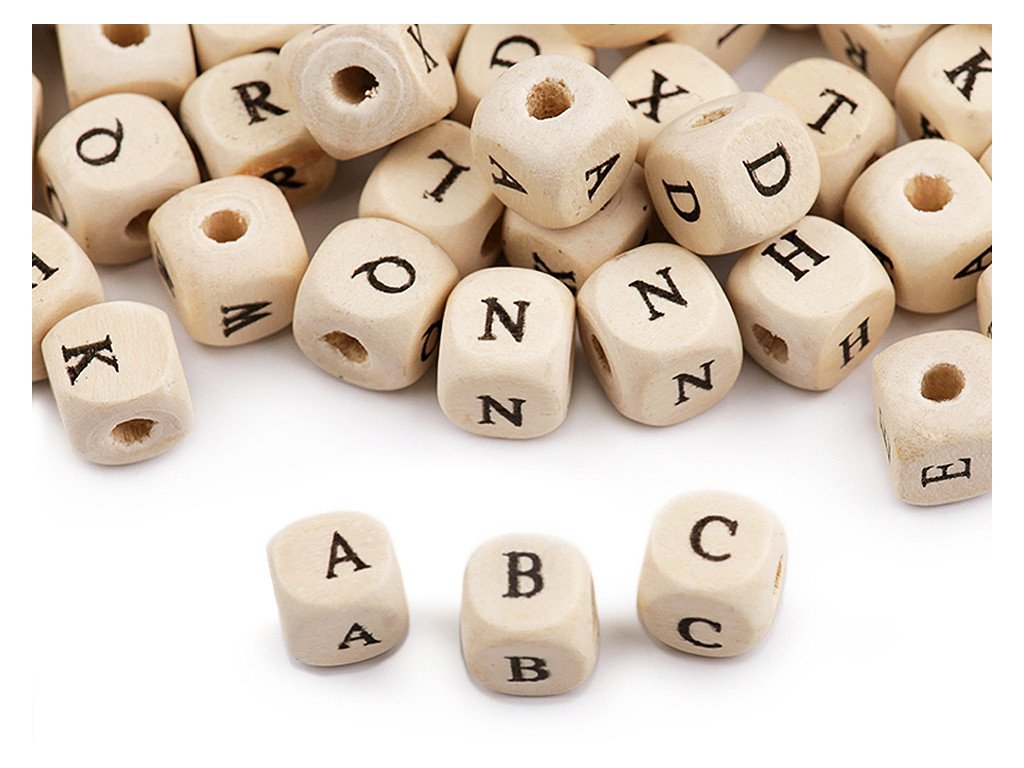 Dřevěné korálky ve tvaru kostky s potiskem písmenek. Písmena jsou na všech ploškách, chybí pouze na stranách s průvleky. Horizontálně umístěný průvlek umožňuje skládat z písmen slova, jména apod. Díky velkému průvleku se korálky hodí i na gumičkové náramky. Tělo korálku má přírodní barvu, písmena jsou černá. Jako návlekový materiál můžete použít pruženky a silony, různé šňůrky, gumičky apod. V sáčku je mix různých písmen. Sáček nemusí obsahovat všechny kombinace písmen z abecedy, jednotlivá balení se od sebe mohou lišit. Písmenka jsou z anglické abecedy, tudíž bez diakritických znamének. V jednom sáčku je cca 80 korálků. Korálky jsou ve 2. jakosti, protože mohou mít špatný potisk.- Rozměry: 10 x 10 x 10 mm