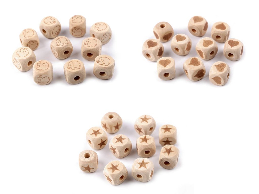 Dřevěné korálky kostka slon, srdce, hvězda 14x14 mm