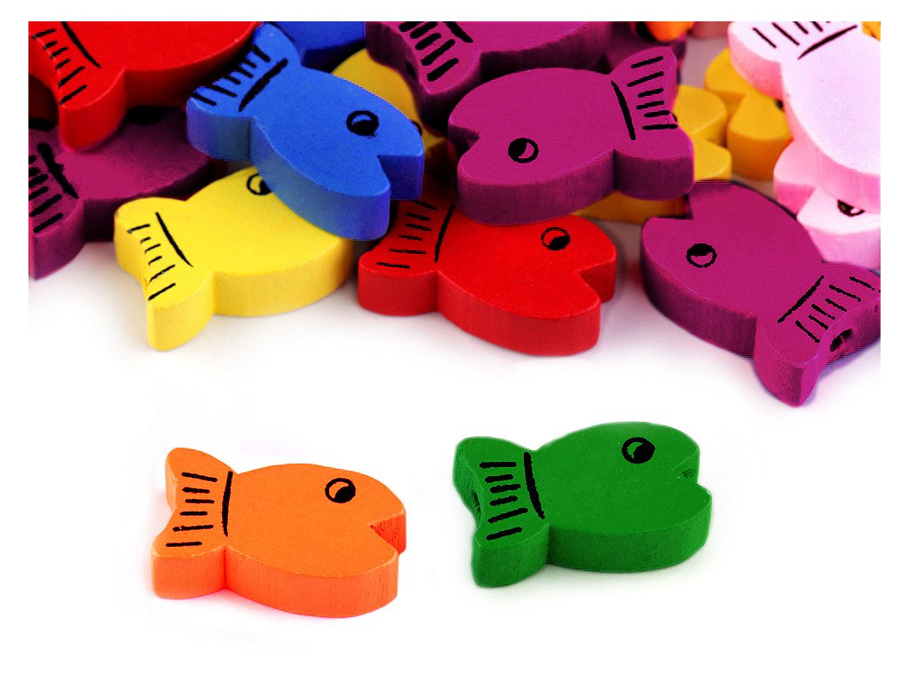 Mix korálků barevných rybiček s oboustranným potiskem potěší nejen korálkářky, ale i děti. Můžete je navlékat na silon nebo tenkou voskovanou šňůrku s dalšími korálky. Šňůrku můžete zdobit i uzlíky, sami budete nadšeni z originálního náhrdelníku, který vám vznikne. Děti si mohou sami navléci jednoduchý náramek z pruženky. Rybičky budou vypadat, že plují za sebou. Nevhodné pro děti do 3 let.- Rozměry: č. 2: 12 x 19 mm