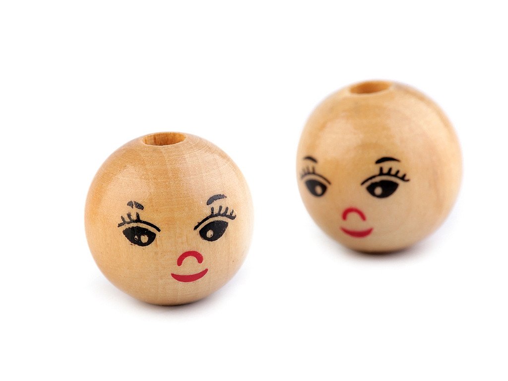 Dřevěné korálky s malovaným obličejem mají jemný lesk díky nalakování. S jejich pomocí si můžete vytvořit postavy andělíčků, uháčkovat panáčka, vytvořit veselý náhrdelník, vyrobit prstové maňásky, veselé zápichy do květináče apod. Díky malbě se od sebe jednotlivé korálky mohou lišit. Může se lišit i kresba dřeva, včetně barvy. Vzhledem k technologii zpracování dřeva mohou být okolo průvleků otřepky. Výrobek není vhodný pro děti do 3 let.- Průměr: 18 mm