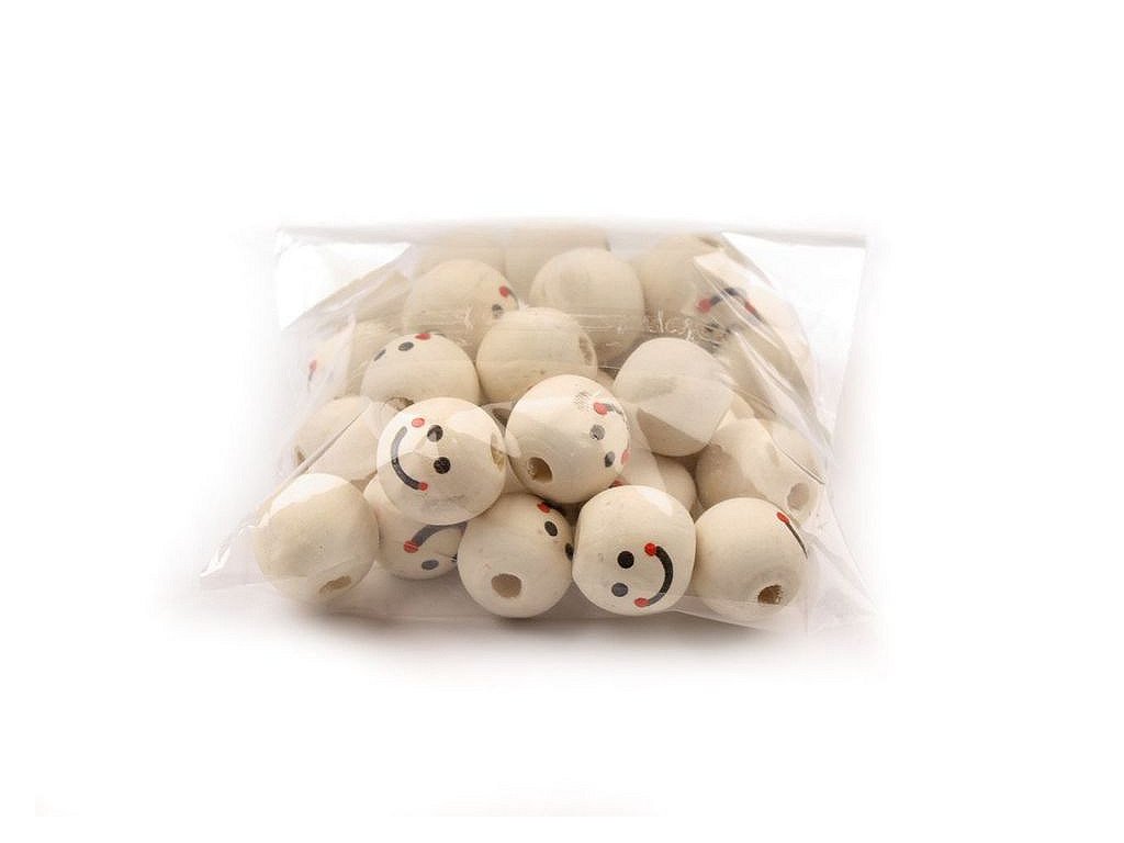 Dřevěné korálky s ručně malovaným obličejem. S jejich pomocí si můžete např. uháčkovat panáčka, vytvořit veselý náhrdelník apod. V originálním balení jsou možné 3% kazových korálků (šikmě seříznutých). Díky ruční malbě se od sebe mohu lišit, včetně kresby dřeva.- Průměr: 18 mm