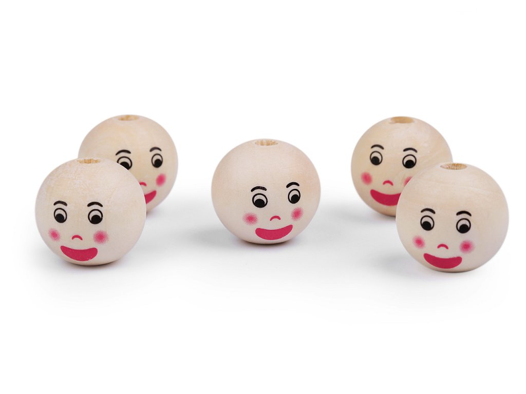 Dřevěné korálky s malovaným obličejem jsou přírodní, nelakované. S jejich pomocí si můžete vytvořit postavy andělíčků, uháčkovat panáčka, vytvořit veselý náhrdelník, vyrobit prstové maňásky, veselé zápichy do květináče apod. Díky malbě se od sebe jednotlivé korálky mohou lišit. Může se lišit i kresba dřeva, včetně barvy. Vzhledem k technologii zpracování dřeva mohou být okolo průvleků otřepky.- Průměr: 22 mm