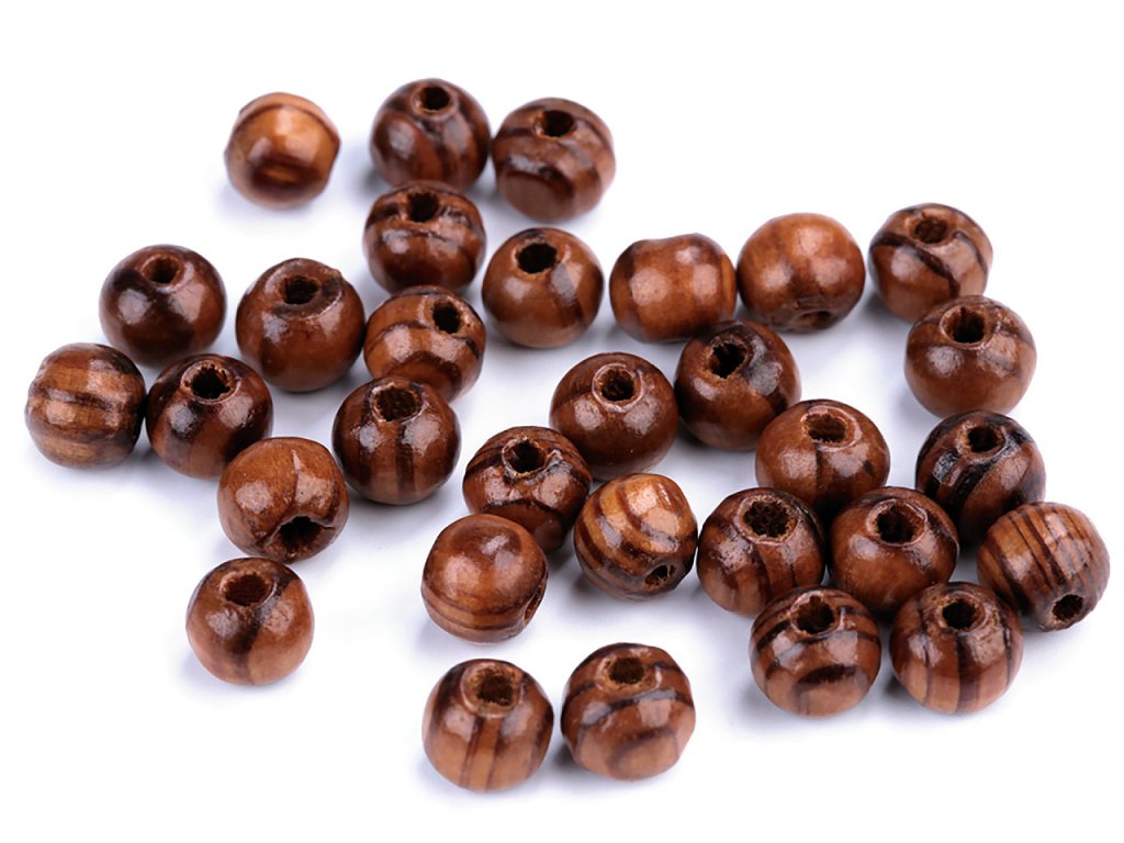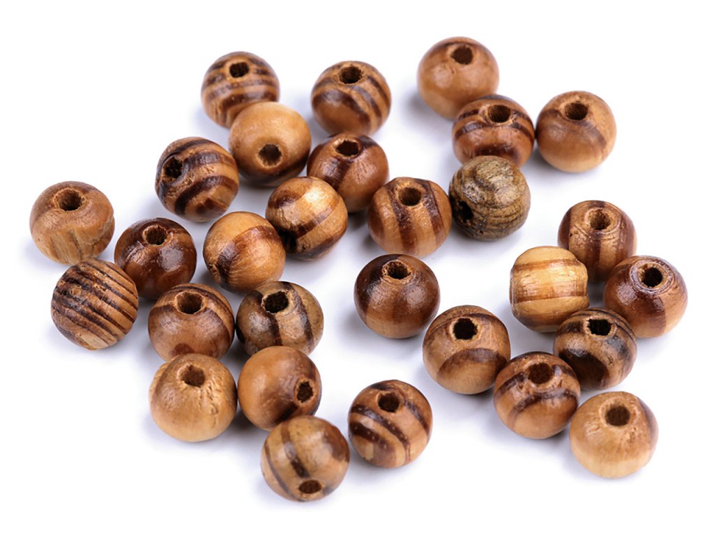 Dřevěné korálky s výraznou kresbou dřeva jsou lakované. Jsou vyrobené z borovice. Hodí se na výrobu náhrdelníků, náramků i náušnic. Jsou využívané na dámské i pánské šperky. Jsou lehké, hodí se i na dozdobení lapačů snů. Kvůli přírodnímu materiálu se mohou korálky mezi sebou barevně lišit. V balení 10 g je cca 70 ks korálků.- Průměr: 8 mm