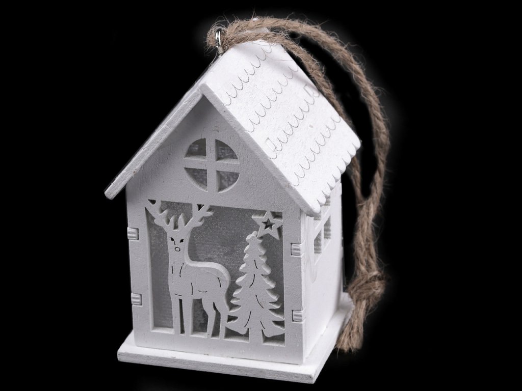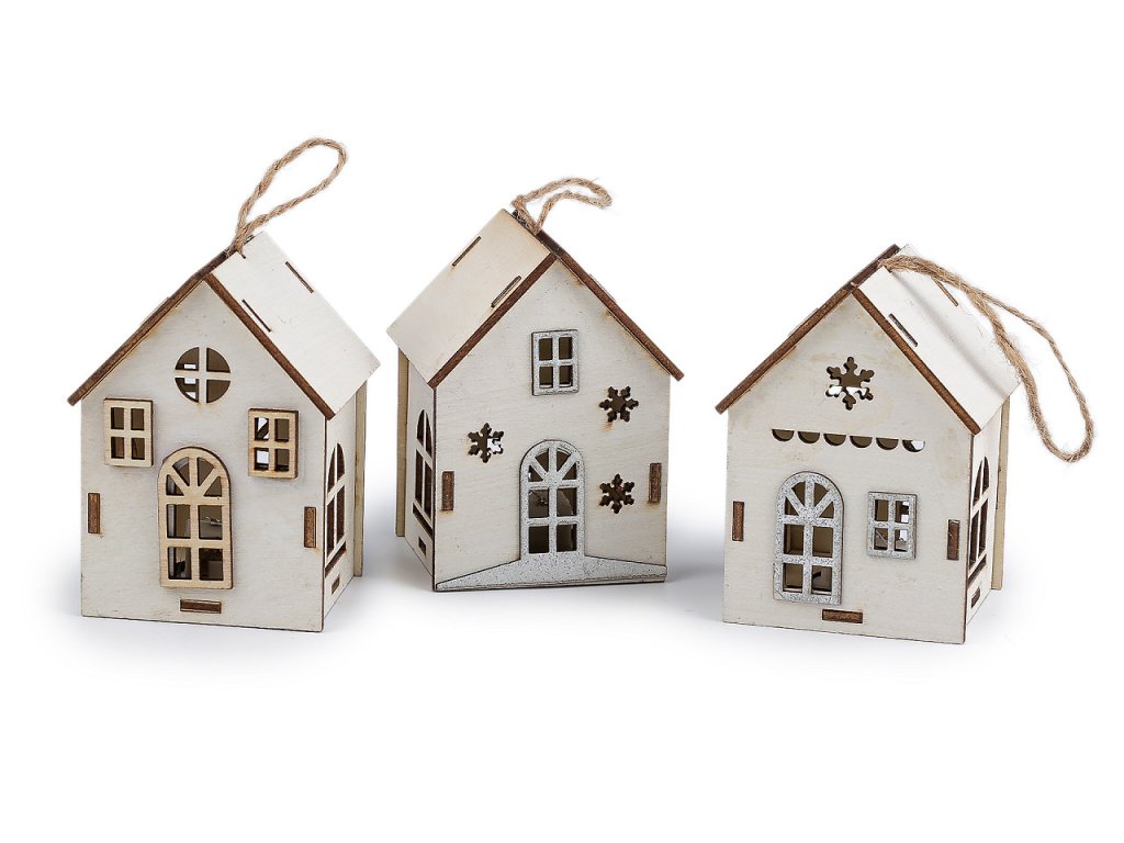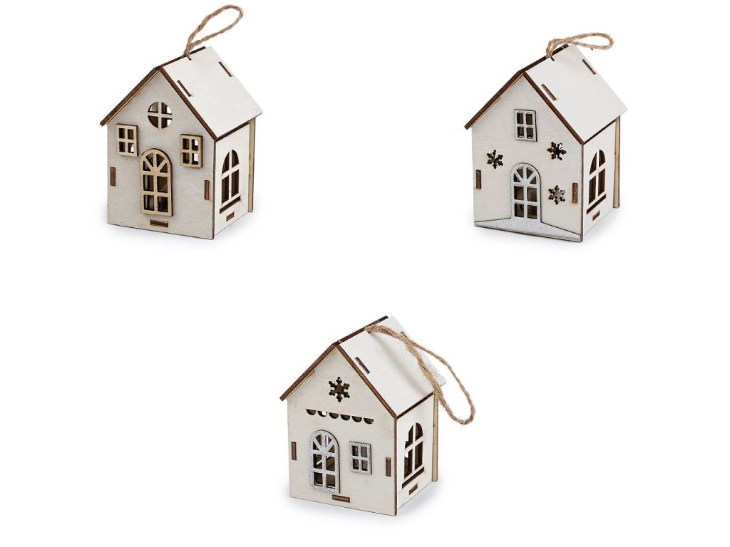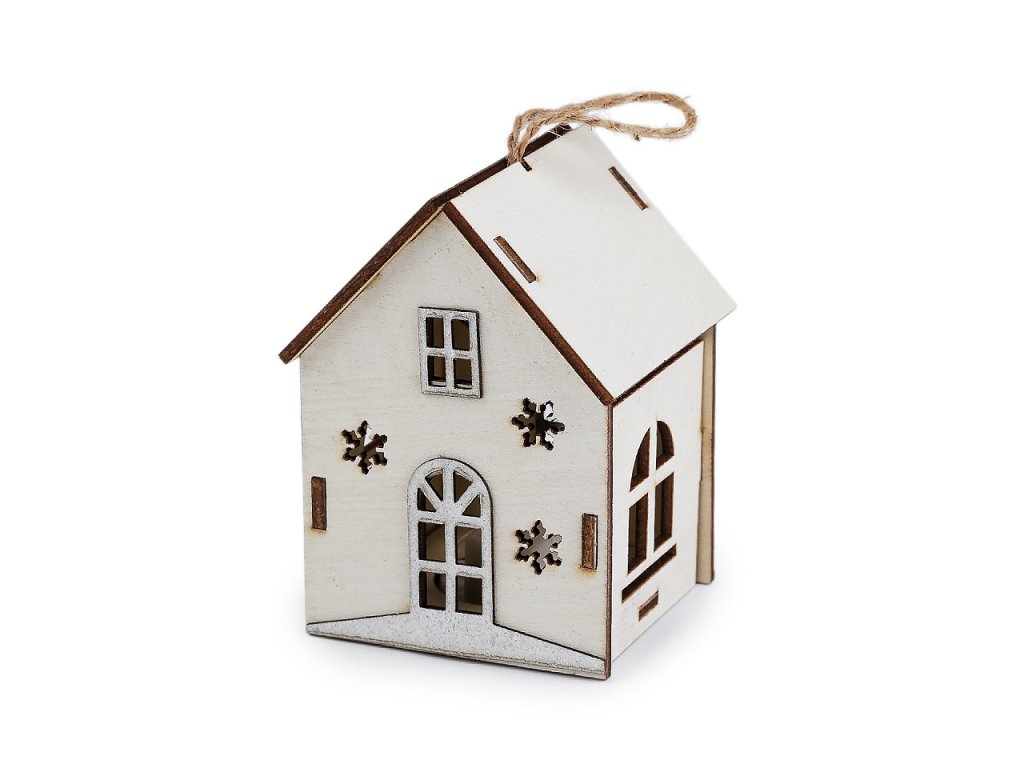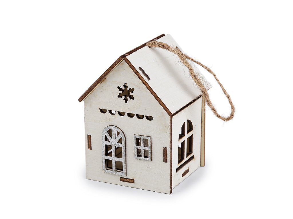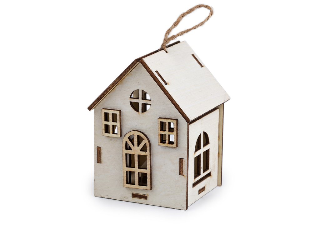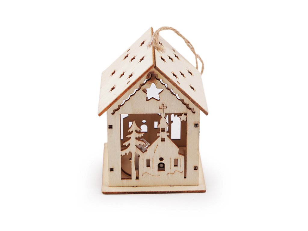 Dřevěný svítící domeček rozzáří každý interiér. Má poutavě zpracované detaily a svítí teplým příjemným světlem. Díky poutku ho můžete pověsit na stromeček nebo na dekorační věnce. Baterie jsou součástí balení (3xLR1130).- Rozměry: 6,5 x 6 cm