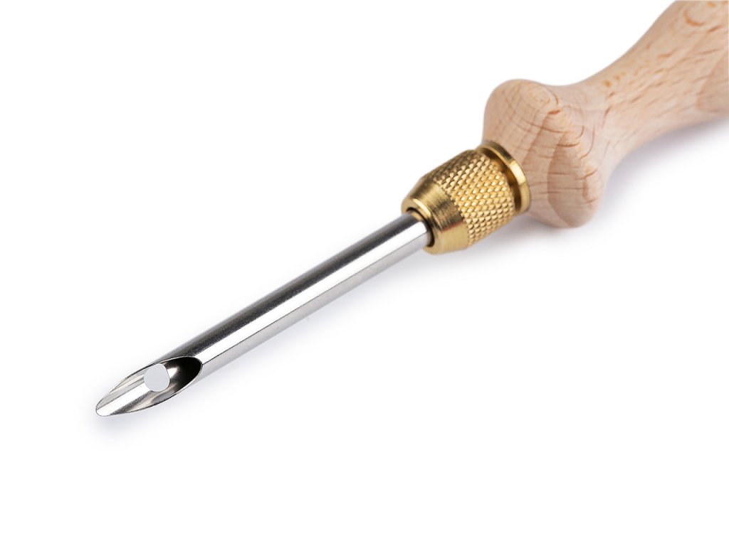 Vyšívání s dutou jehlou je jednoduché a rychlé. Tato jehla má silnější hrot, je proto vhodná na práci s pletací přízí a zdobení svetrů či jiných pletených výrobků. Je šroubovací. Jehla se do materiálu pouze vpichuje, neprovléká se skrz. Při vyšívání by měla být kolmo k látce. Příze, kterou budete vyšívat, se jehlou provleče. Vyšívá se tak, že materiál propíchnete a jehlu povytáhnete zpět těsně nad ním, hrot posunete kousek ve směru vyšívání a opakujete. Snažte se za přízi moc netahat, jinak se stehy budou párat. Dokud se celý motiv zezadu nepodlepí například vlizelínem, může se celý najednou vypárat, není zezadu nijak zafixovaný. Rukojeť na jehle je z nelakovaného dřeva.- Délka: 16 cm