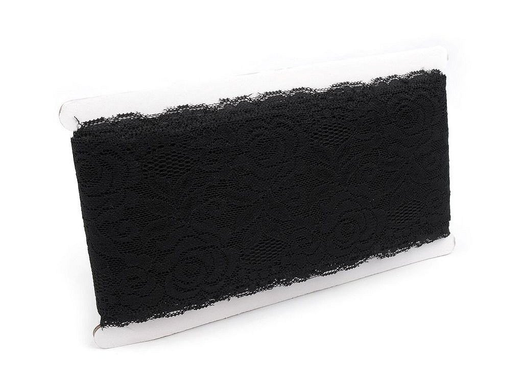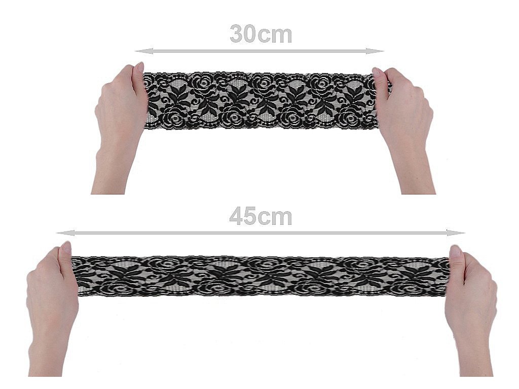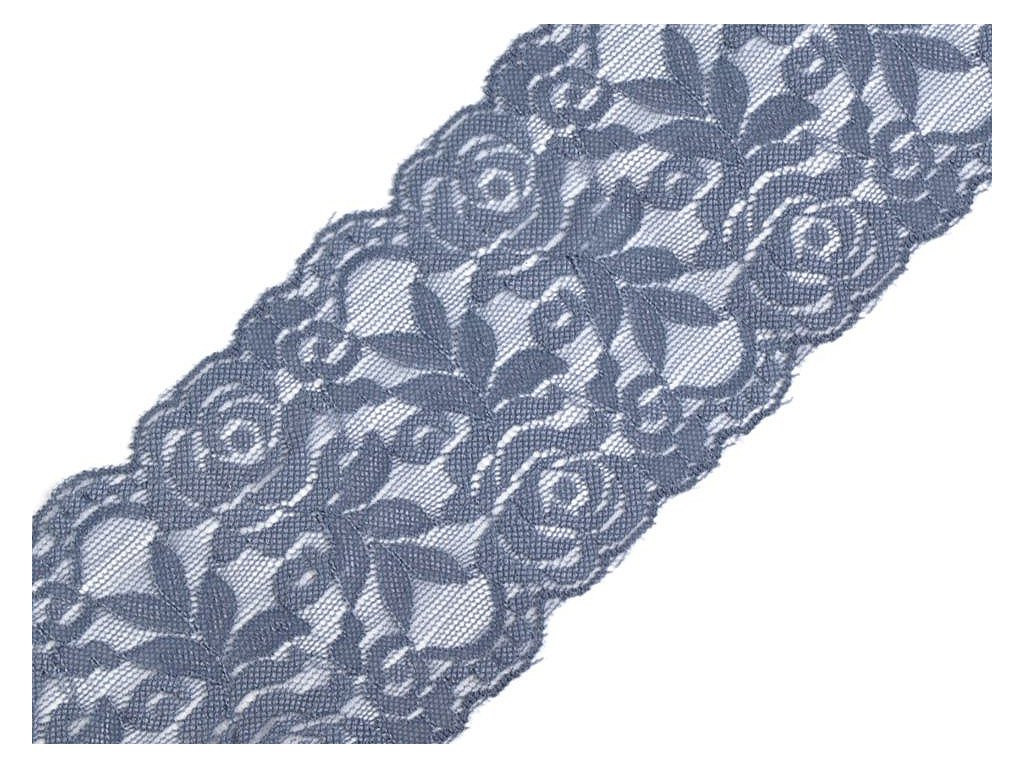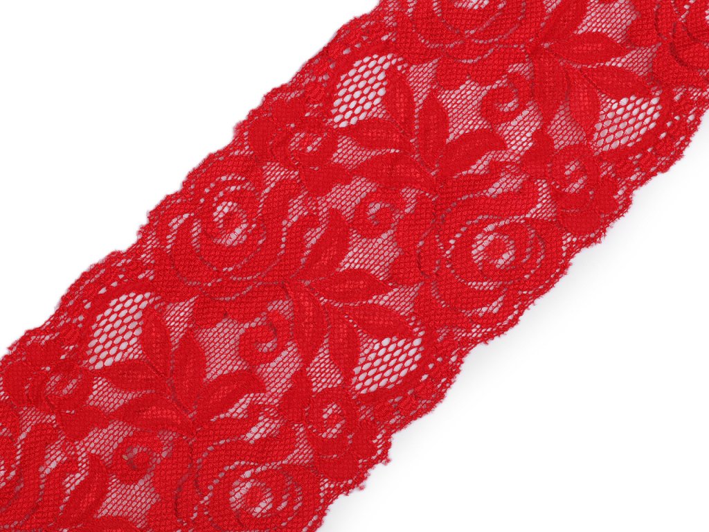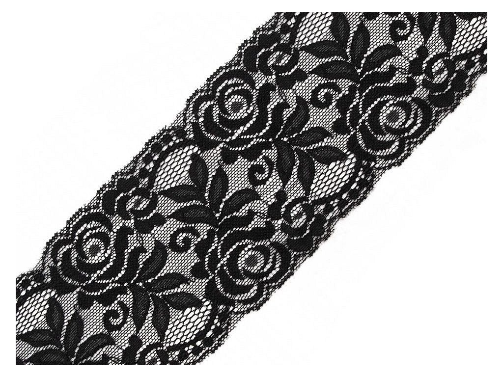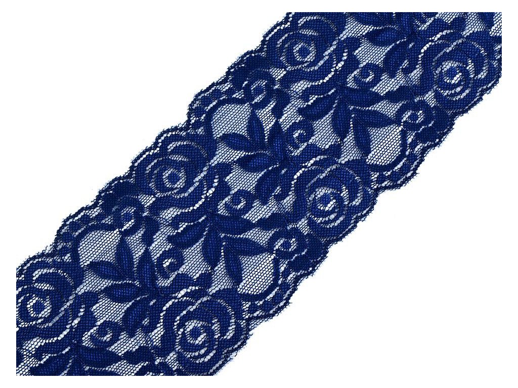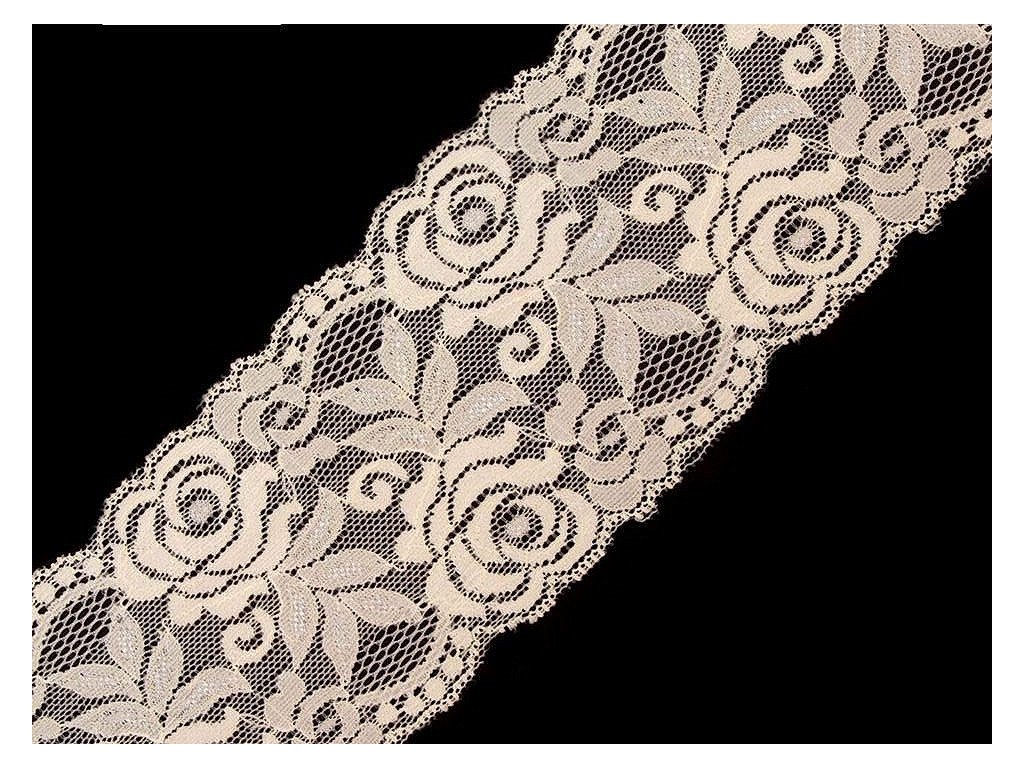 Široká pružná krajka s motivy růží vám originálně ozdobí oděvy nebo doplňky. Některé barvy mohou být širší až o 1 cm. Použití: S krajkou můžete dát nový vzhled halenkám, sukním nebo společenským a svatebním šatům. Je vhodná také na výrobu čelenek do vlasů nebo k našití jako ozdoba na ubrusy a polštáře. Krajka může mít v návinu 4 až 5 prostřihů. Šíře krajky se po konečné úpravě může lišit o ±6%.- Šíře: 80 - 100 mm