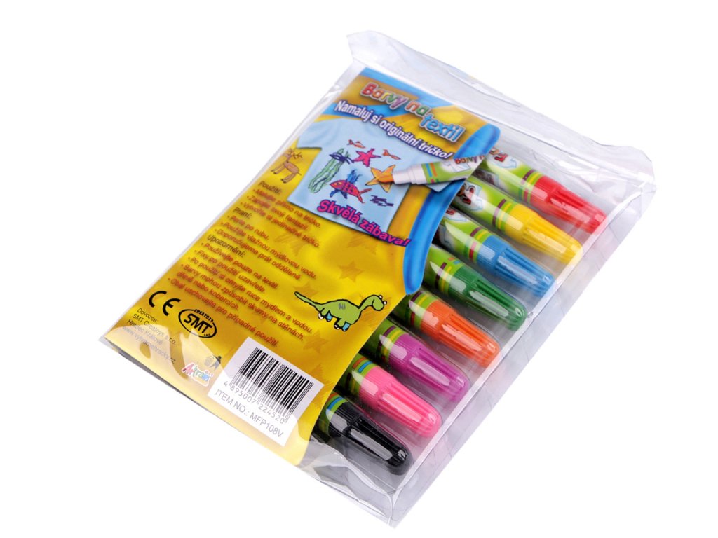 Se sadou kvalitních fixů (popisovačů) na textil si užijete super zábavu. Jsou voděodolné, bezpečné a netoxické. Nemusí se zažehlovat. Jsou vhodné na světlý textil. Můžete je použít na většinu látek, nejvhodnější je bavlna. Kvůli zafixování barvy doporučujeme prát nejdříve po 24 hodinách, po rubové straně, ve vlažné vodě. Upozorňujeme zákazníky, že fixy č.2 jsou vypratelné, hodí se spíše pro dočasné dětské tvoření.- Sada: 6 ks